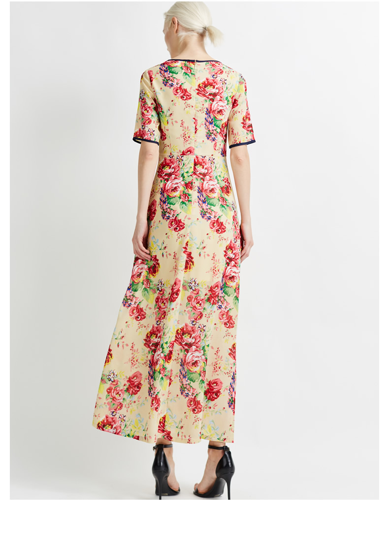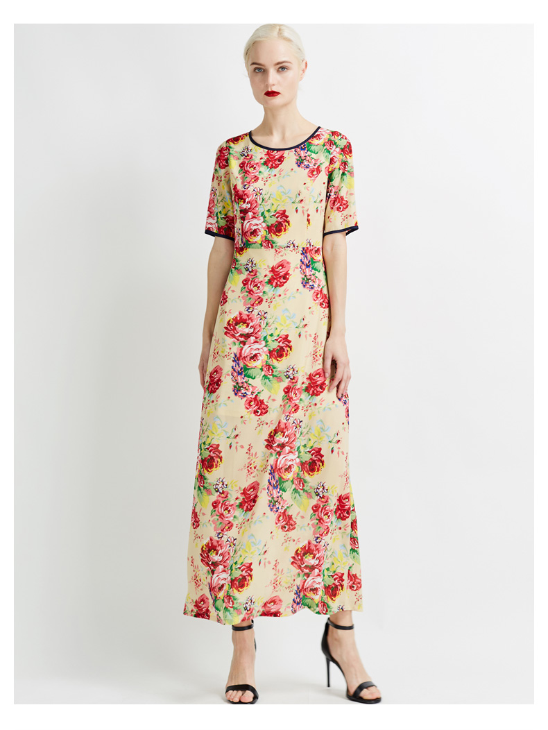 悅空間雪紡大花朵超長款短袖連衣裙復修身印花圓領古淑女氣質歐美