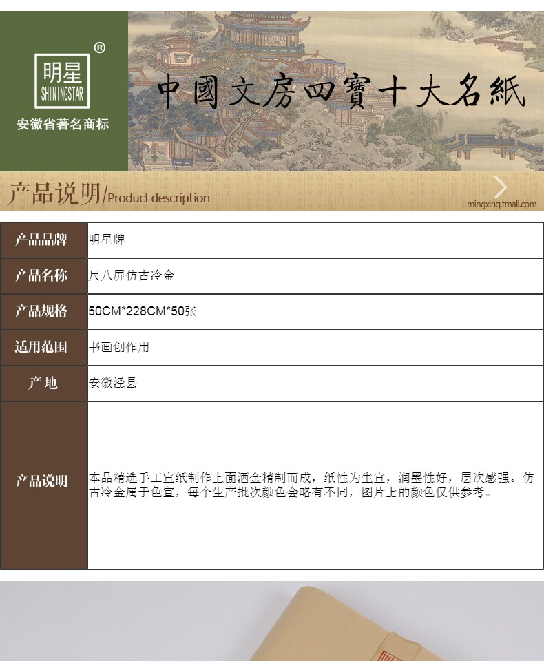安徽明星宣紙手工尺八屏仿古冷金灑金檀皮毛筆字書法創作品專用生宣紙