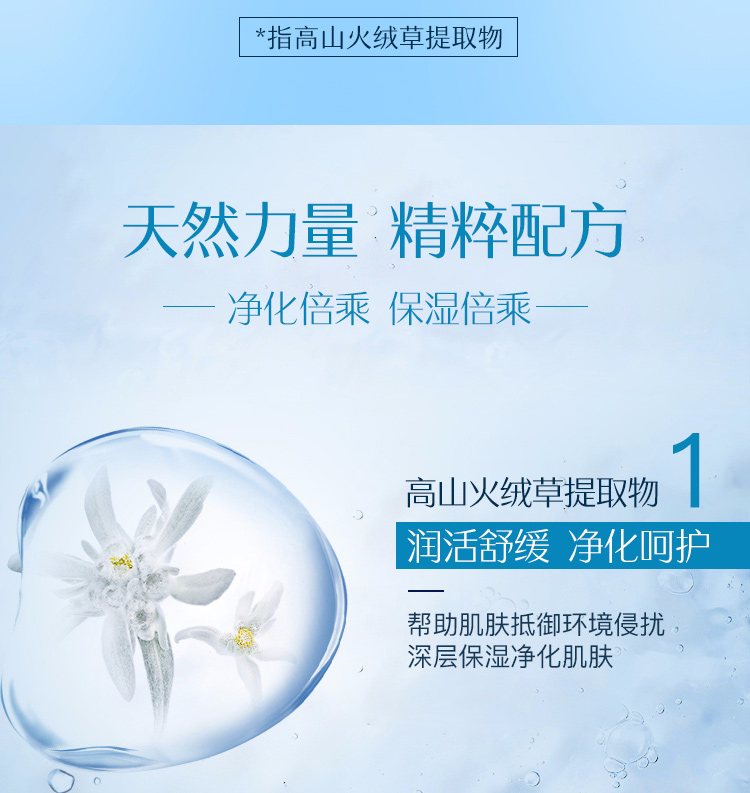 瑞士Pentavitin鎖水磁石*技術持久保濕,雪絨花**抗污染保護系統由外保護,令肌膚呈現純凈、剔透的水潤。