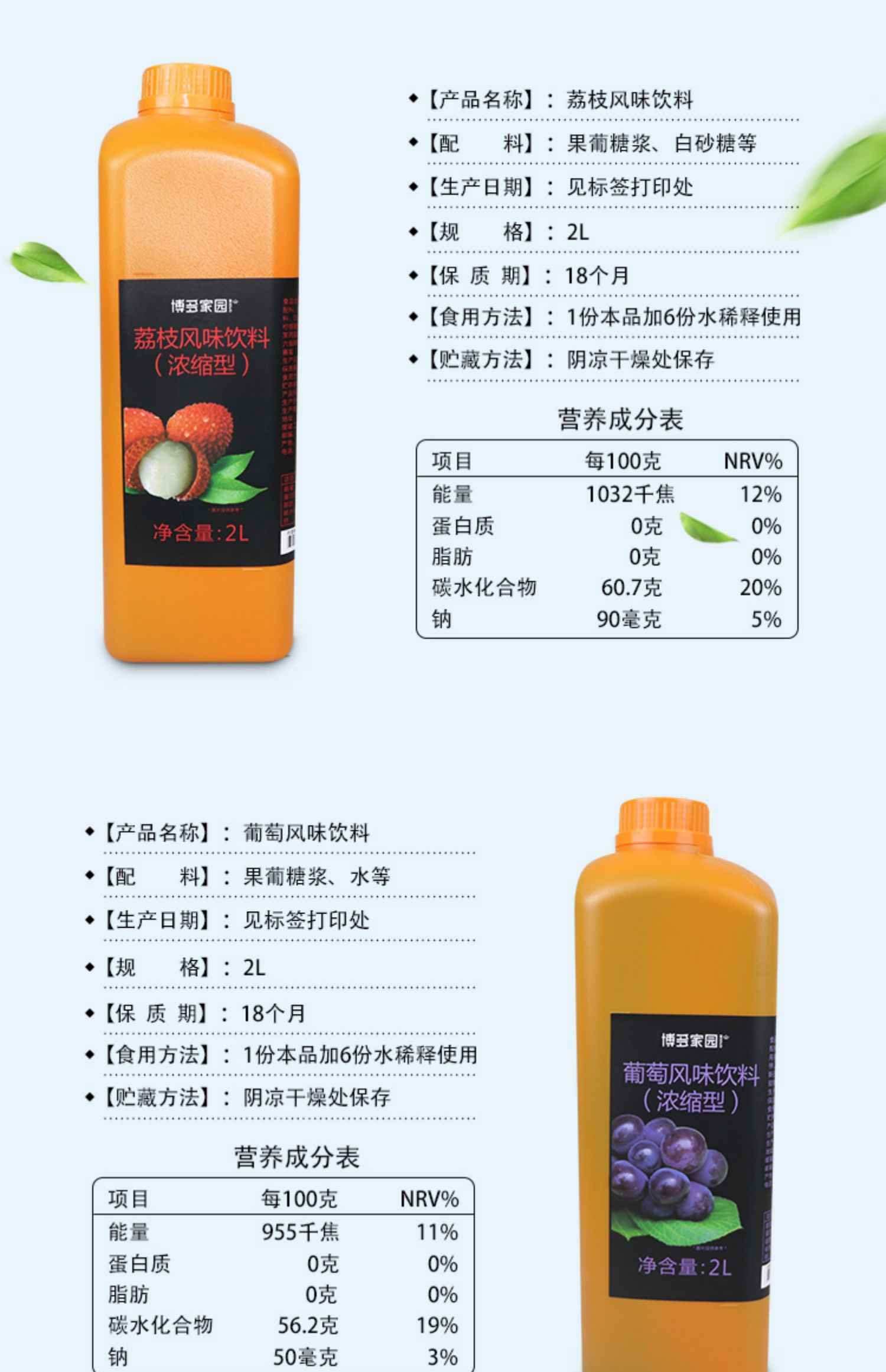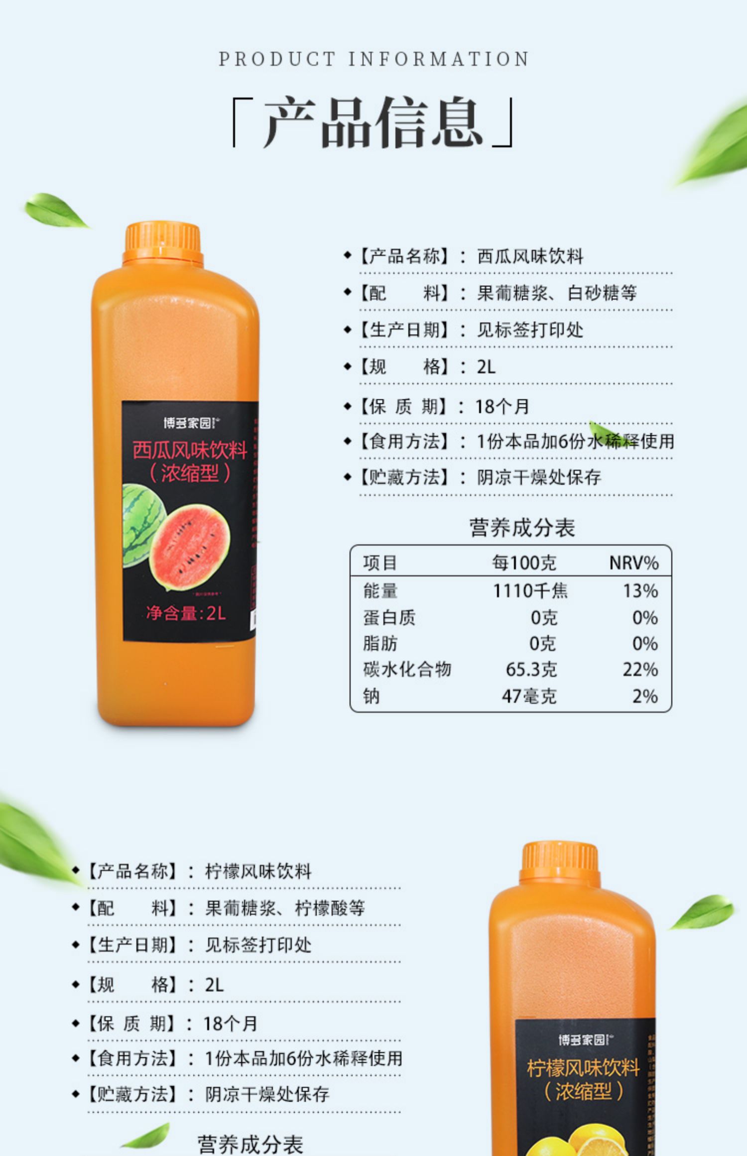 博多家園檸檬荔枝西瓜葡萄風味飲料2L博多濃縮果汁奶茶店飲品原料