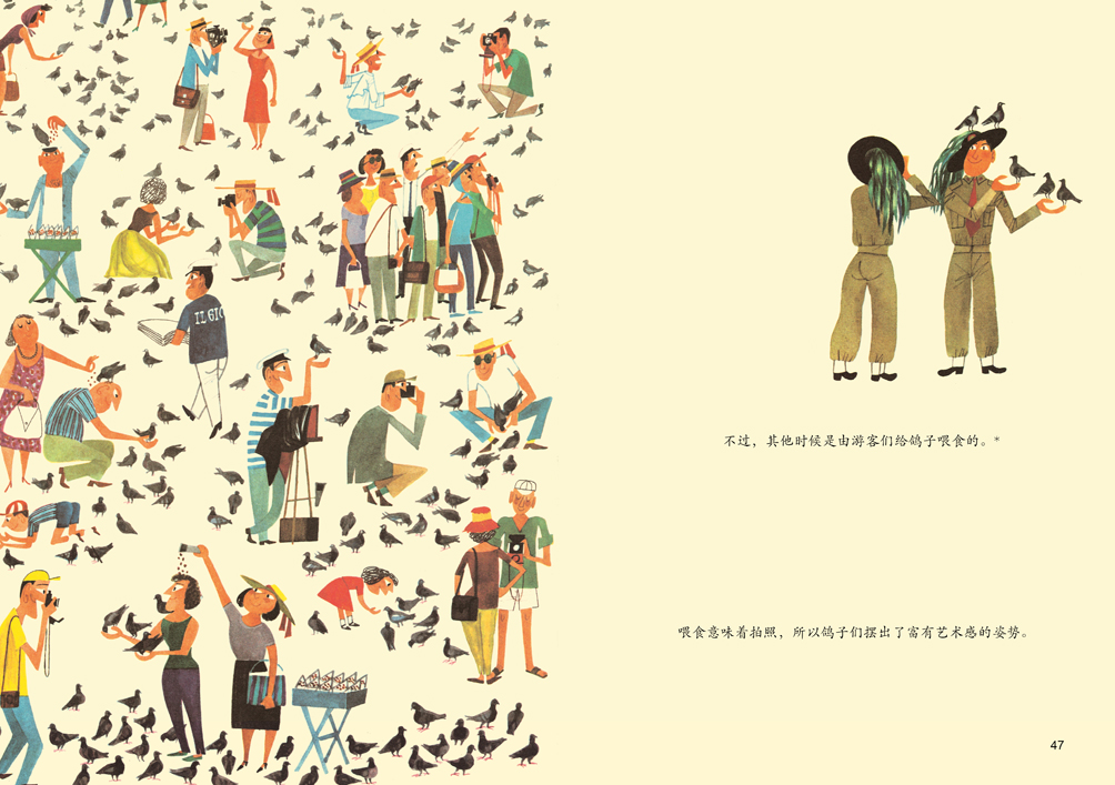 米先生觀察每座城市的服飾、職業、建筑、動物、交通,