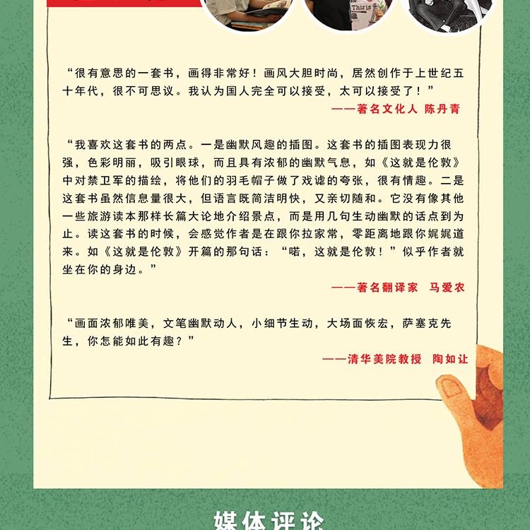 “我喜歡這套書的兩點。一是幽默風趣的插圖。這套書的插圖表現力很強,色彩明麗,吸引眼球,而且具有濃郁的幽默氣息,如《這就是倫敦》中對禁衛軍的描繪,將他們的羽毛帽子做了戲謔的夸張,很有情趣。二是這套書雖然信息量很大,但語言既簡潔明快,又親切隨和。它沒有像其他一些旅游讀本那樣長篇大論地介紹景點,而是用幾句生動幽默的話點到為止。讀這套書的時候,會感覺作者是在跟你拉家常,零距離地跟你娓娓道來。如《這就是倫敦》開篇的那句話:“喏,這就是倫敦!”似乎作者就坐在你的身邊。”