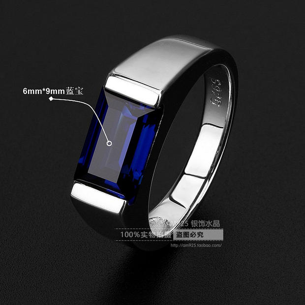 合成藍寶石男銀鍍白金坦桑男戒指環