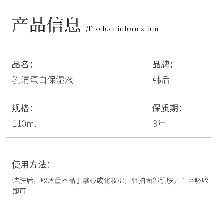 韓后爽膚水乳清蛋白調理液補水保濕溫和滋潤化妝水護膚品官網正品