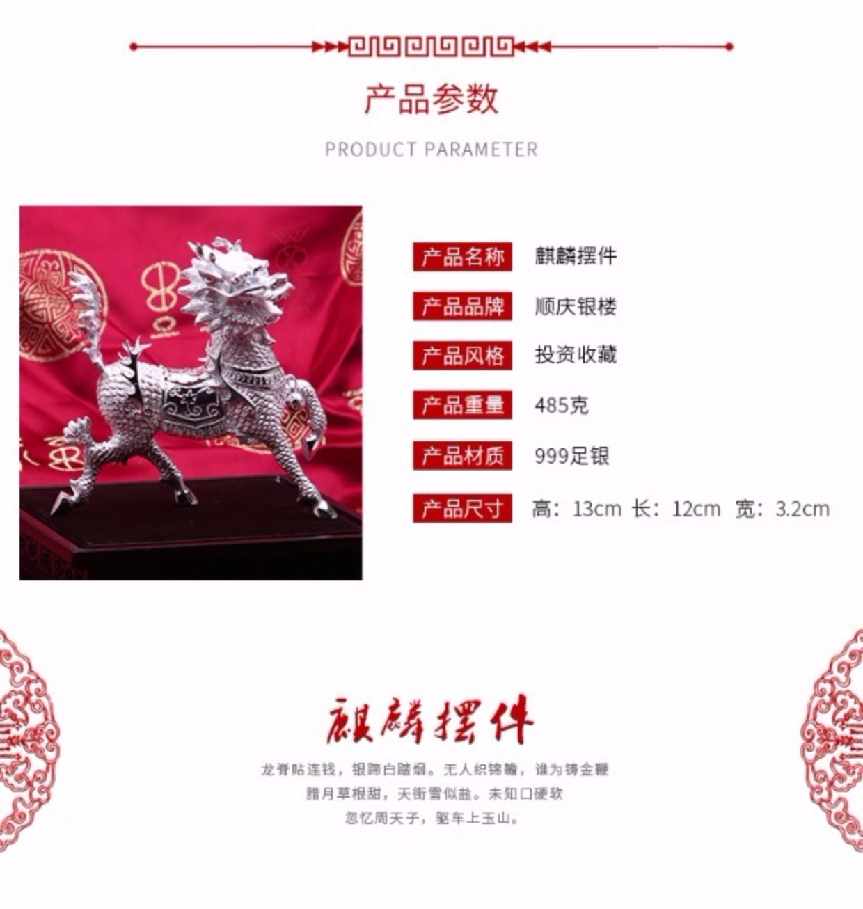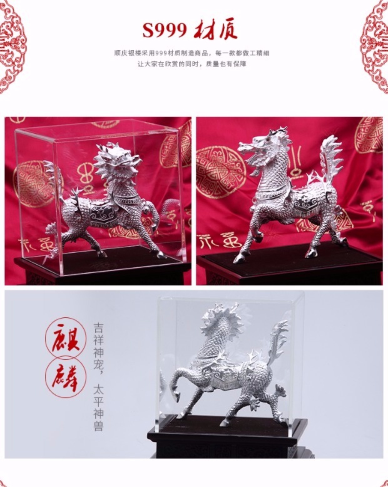 順慶銀樓S999足銀麒麟神獸瑞獸鎮宅純銀投資收藏送長輩領導禮擺件