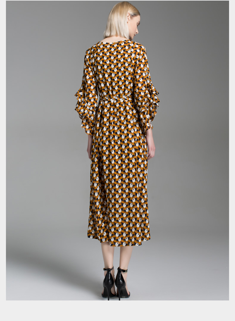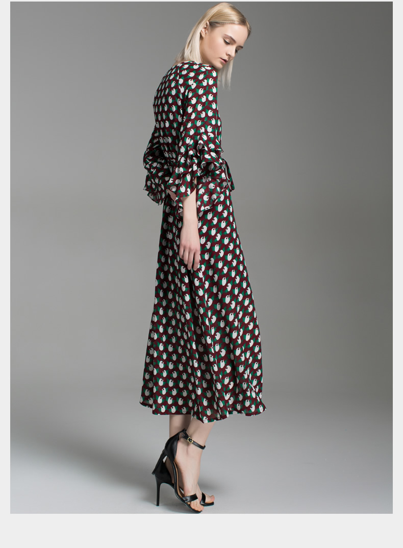 悅空間復古印花超長款長袖ol連衣裙