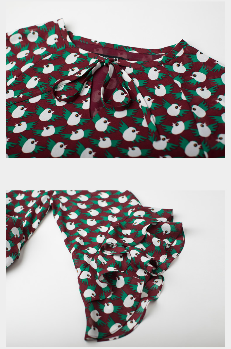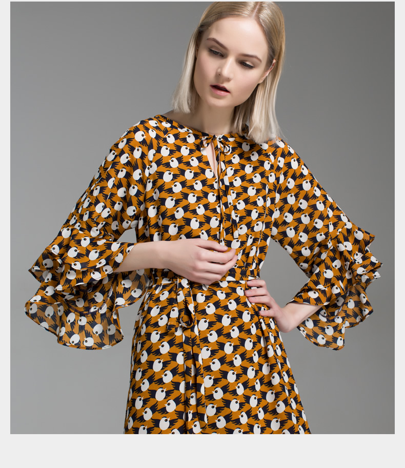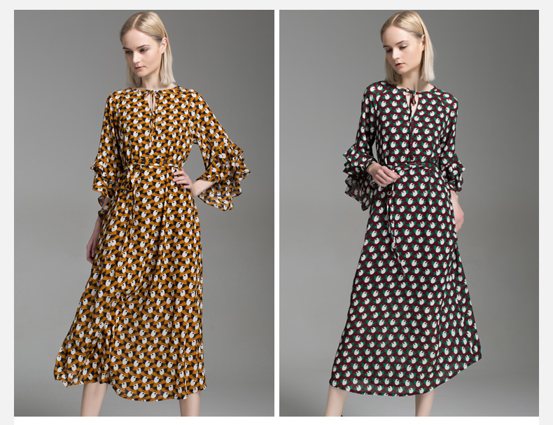 悅空間超長款雪紡連衣裙復古女碎花七分袖荷葉邊印花氣質系帶長裙