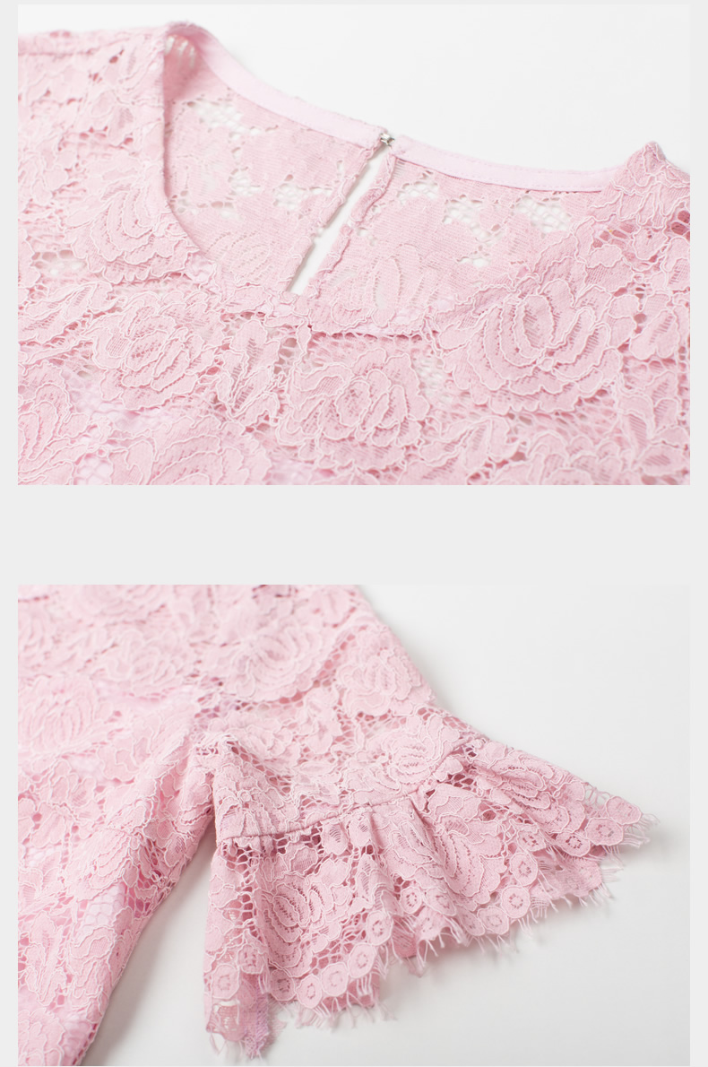 悅空間氣質鏤空鉤花喇叭袖蕾絲連衣裙女超長修身夏季A字復古長裙