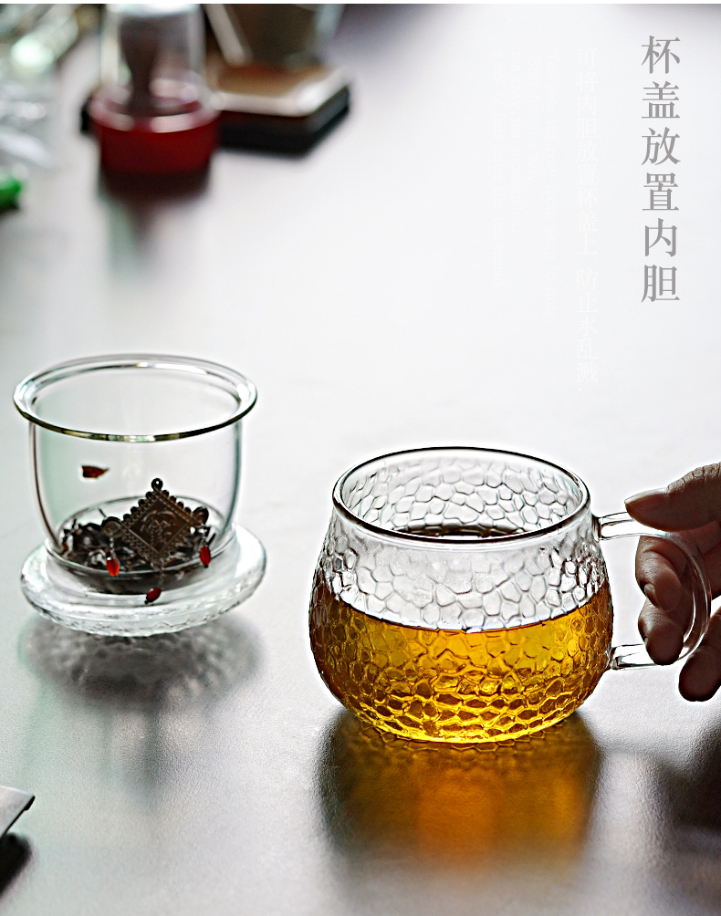 錘紋加厚耐熱玻璃三件式花茶杯帶蓋內膽過濾泡茶杯水杯辦公馬克杯