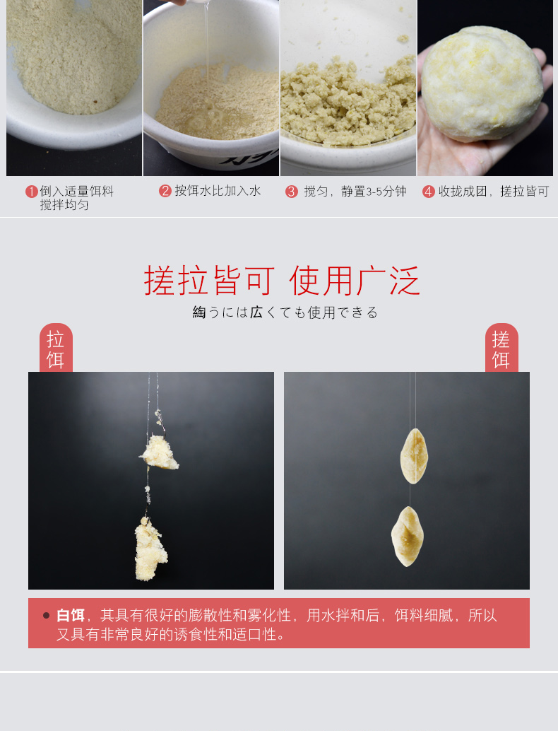 優點在于主料薯粉質優,輔料小麥蛋白純正,餌性“溫和”,誘魚、留魚