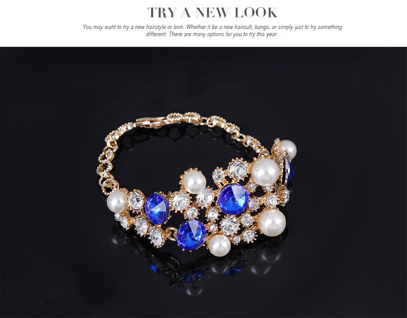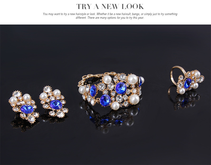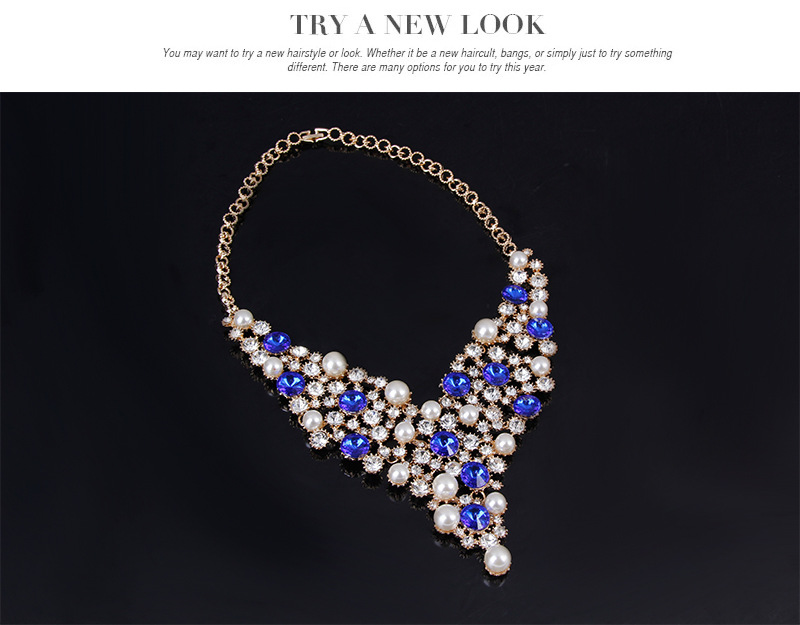 包郵 歐美夸張珍珠藍寶石鎖骨項鏈耳環四件套 結婚宴會禮服配飾品