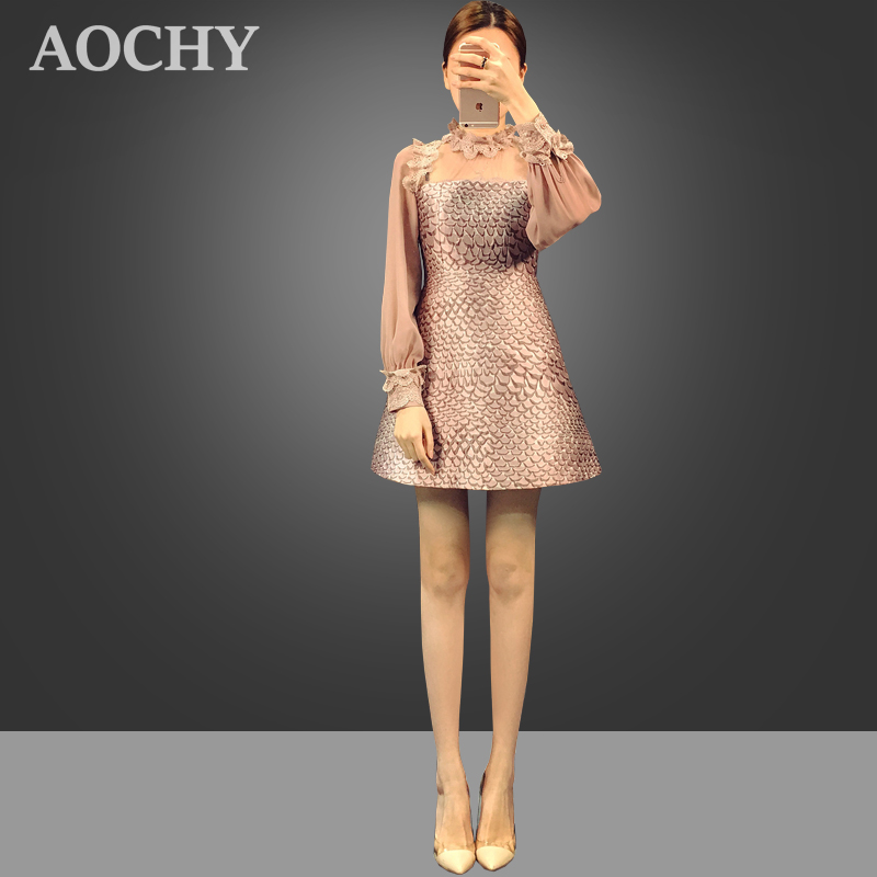 蕾絲花邊立領透視網紗提花收腰連衣裙宴會婚禮小禮服女2022新款