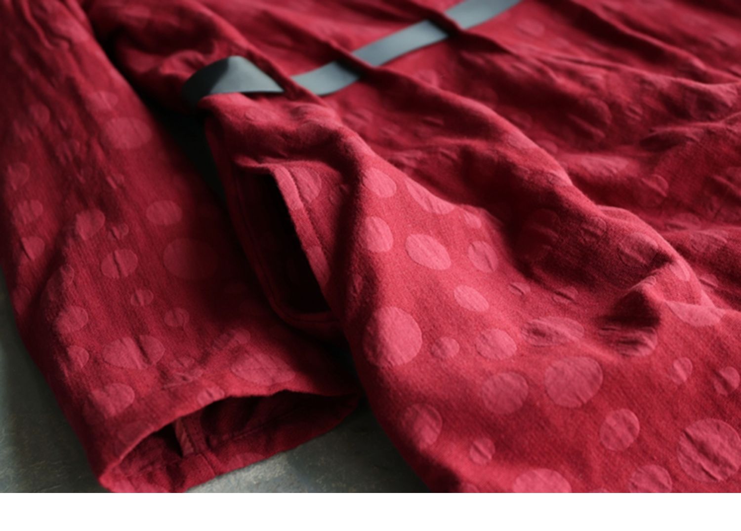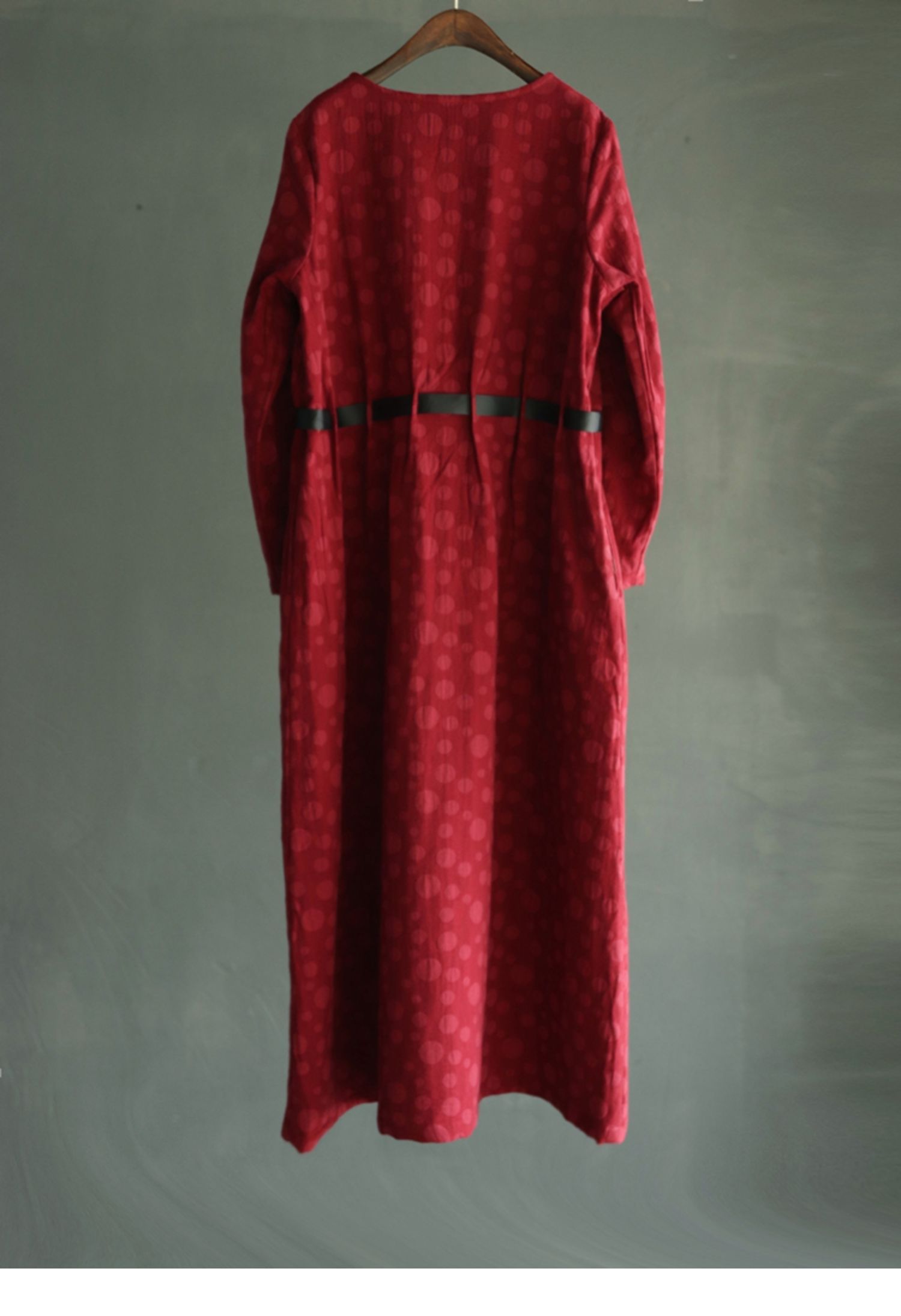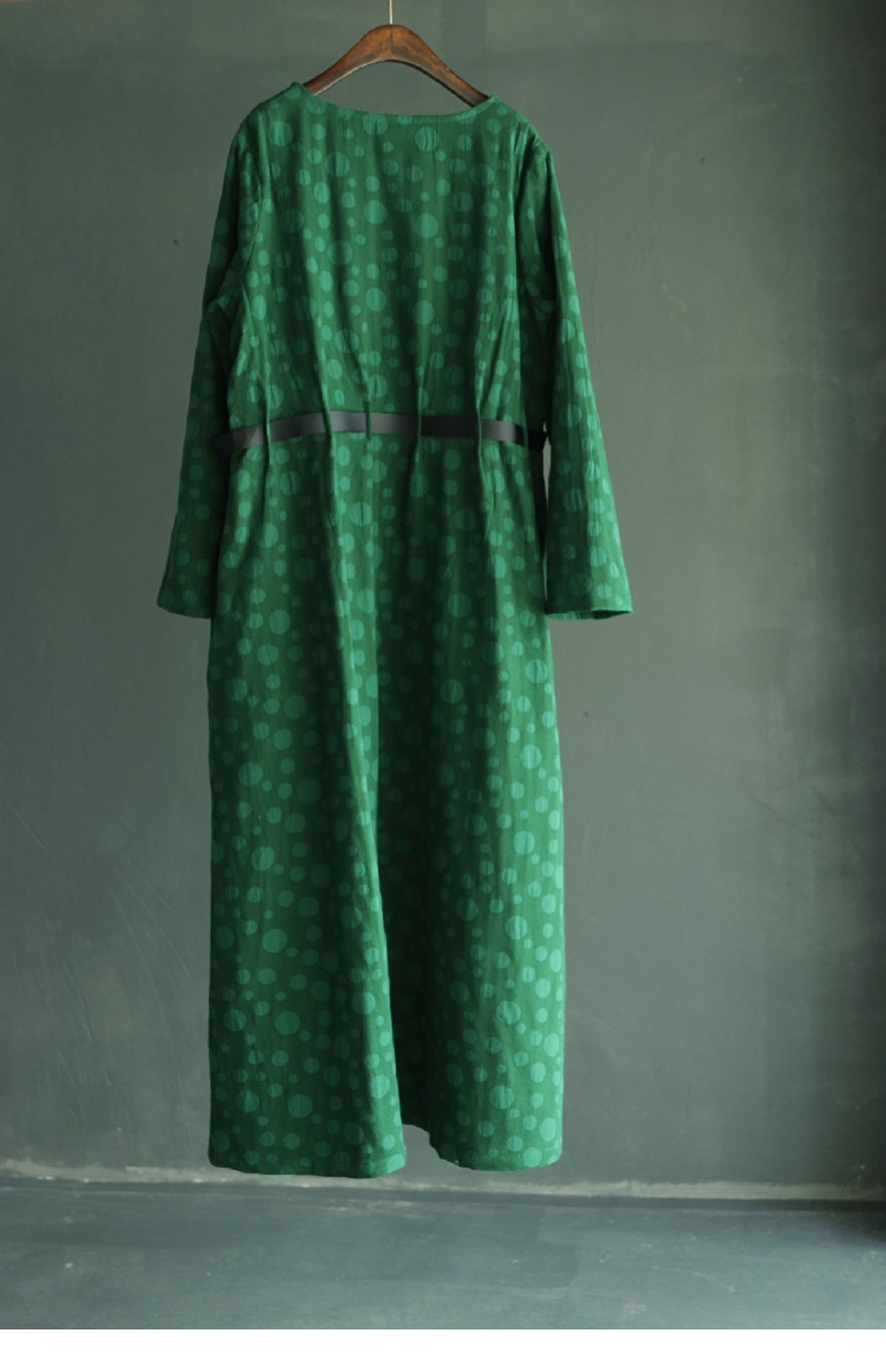 2022秋季新款綠色棉布波點收腰長連衣裙 寬松方領長款文藝袍子女