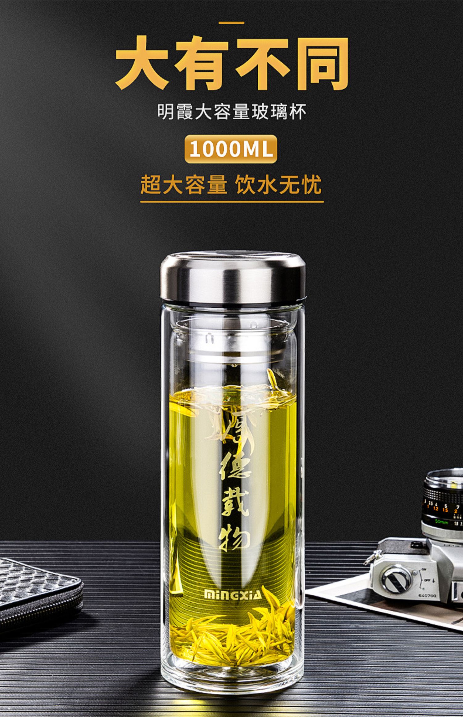 雙層玻璃杯大容量便攜辦公杯男士泡茶杯子不銹鋼帶蓋家用過濾水杯