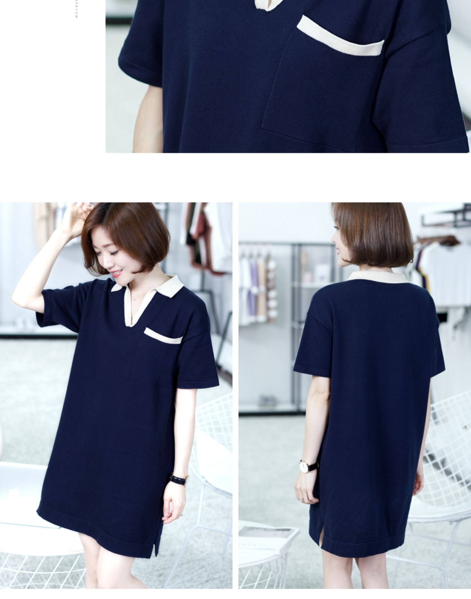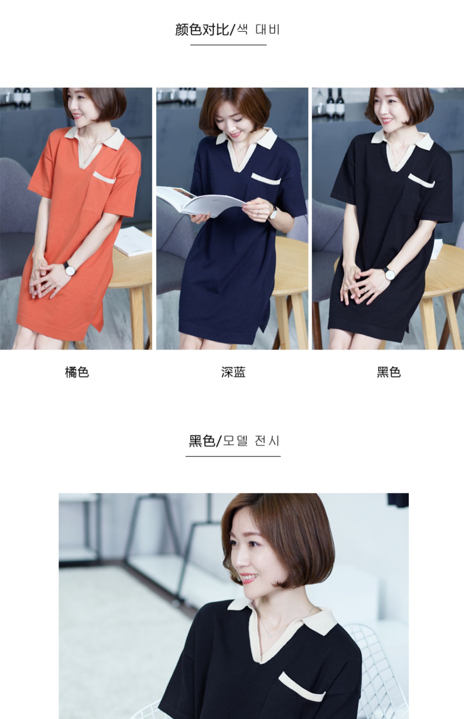 2023新款連衣裙五分袖女士針織衫純色V領中袖中長款寬松大碼夏裝