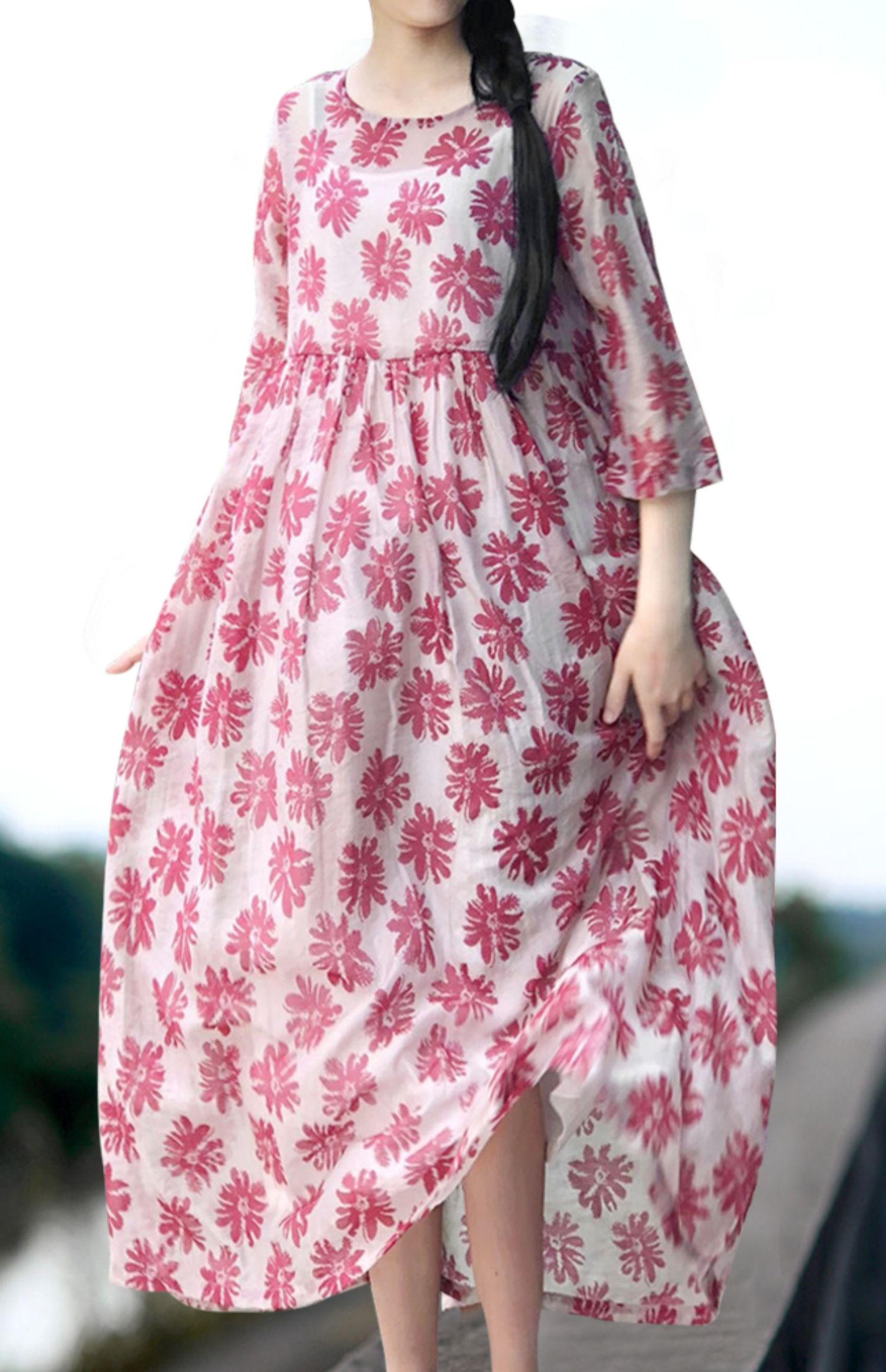 2022年夏款飄逸超細絲麻顯瘦高腰文藝寬松印花大碼連衣裙 大擺裙