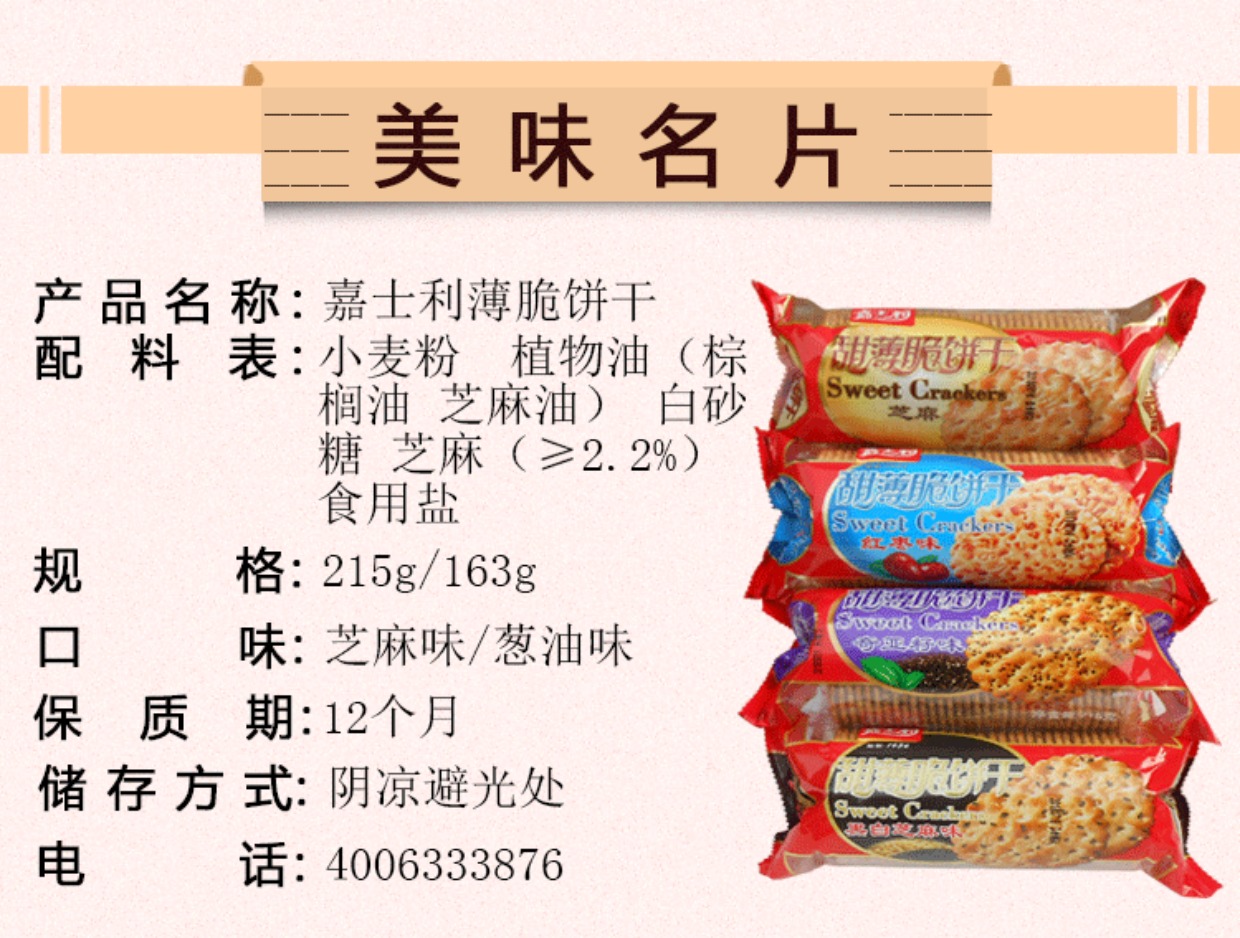 嘉士利甜215g包裝芝麻薄餅薄脆餅干