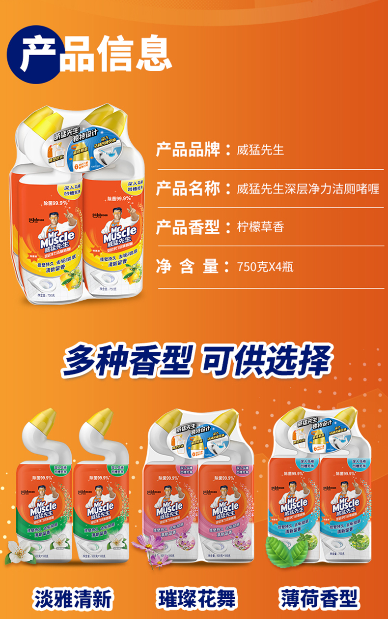 威猛先生家用馬桶潔廁劑潔廁靈潔廁寶檸檬草香750g*4廁所除臭神器