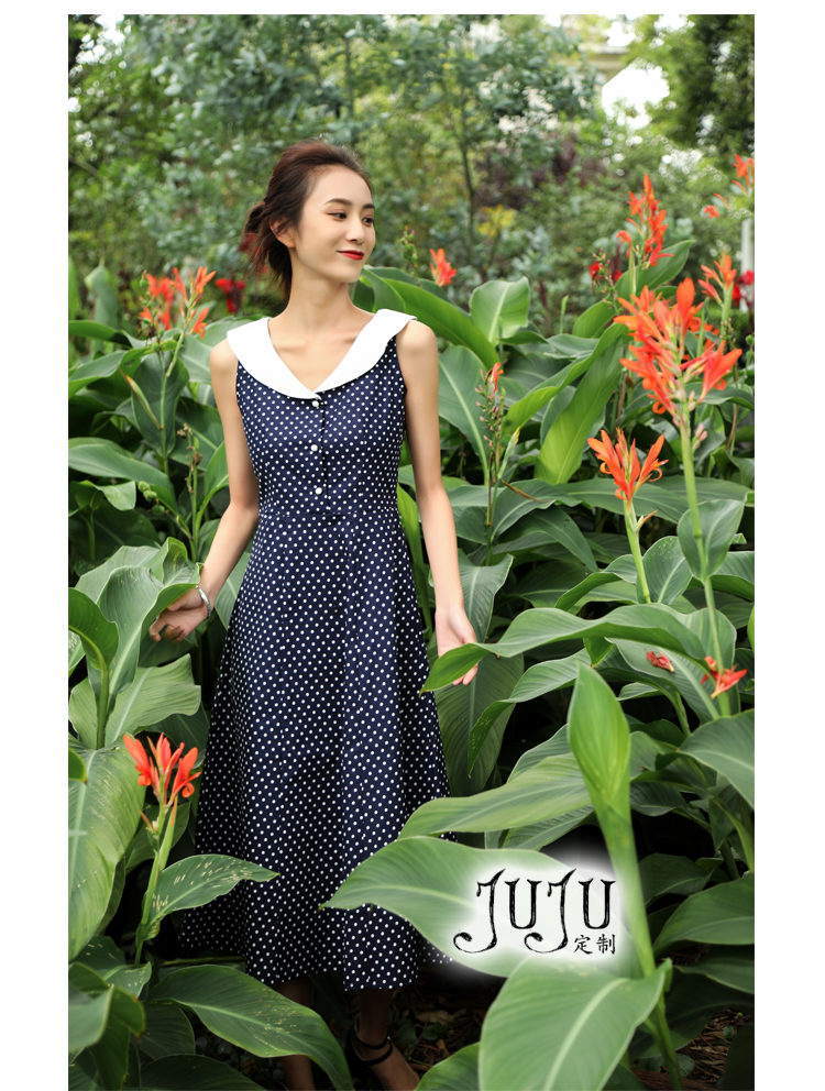 度假風復古奶油領波點珍珠扣修身大擺A字裙高腰無袖連衣裙chic女