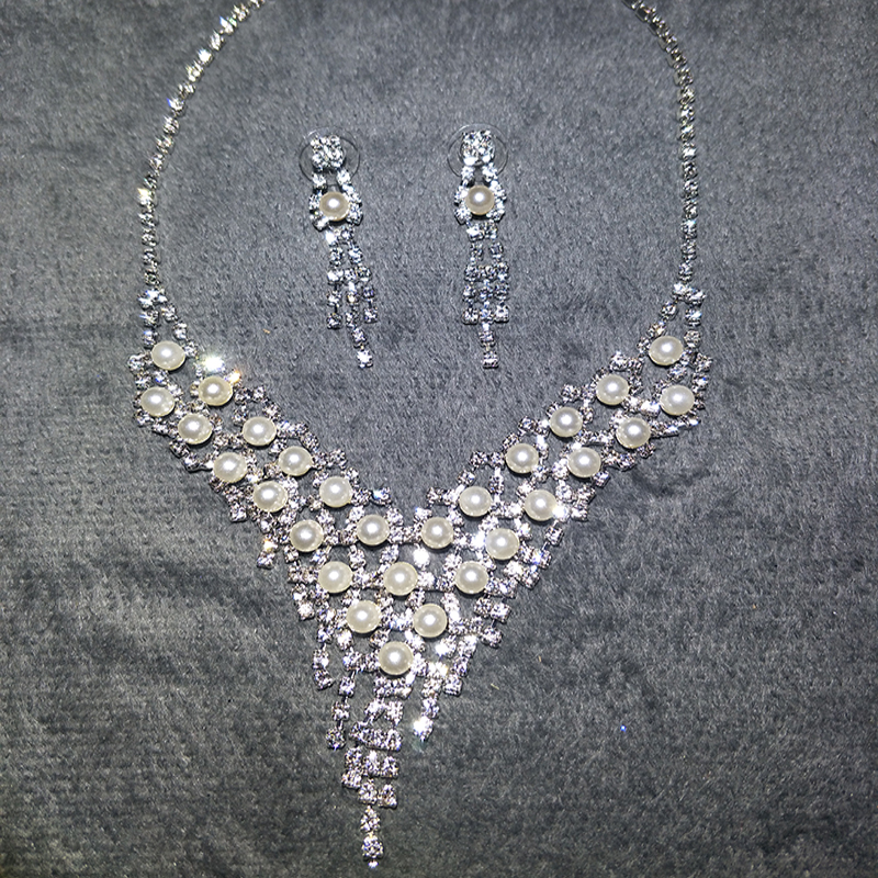 新娘珍珠水鉆項鏈耳環兩件套首飾女時尚百搭婚紗宴會禮服鎖骨配飾