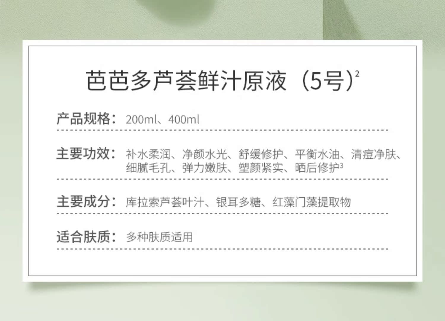 芭芭多蘆薈鮮汁原液5號化妝爽膚水男女士補水保濕敷護膚修護控油