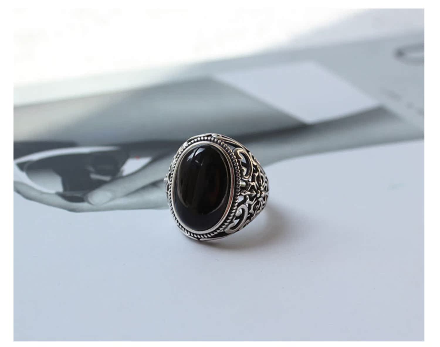 S925純銀大氣復古黑瑪瑙寶石戒指男士高級感指環小眾設計食指戒女