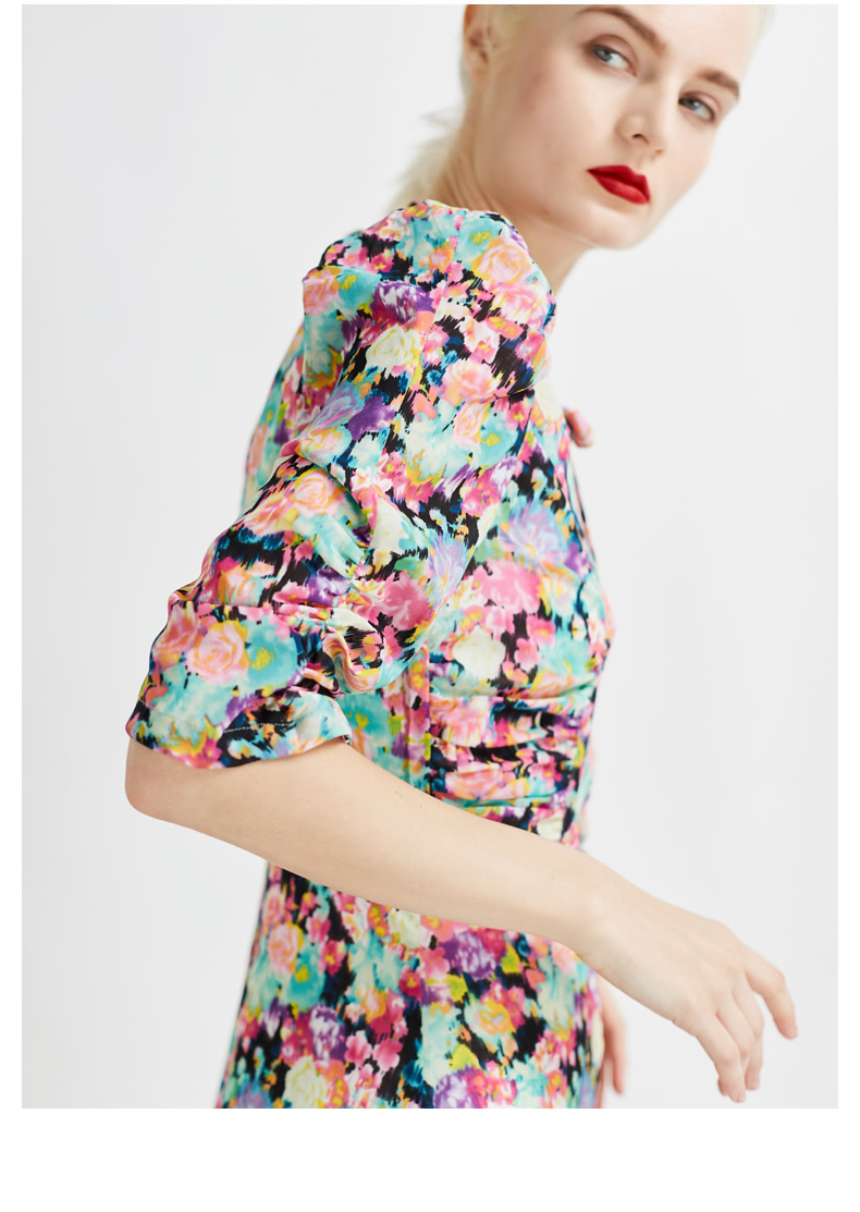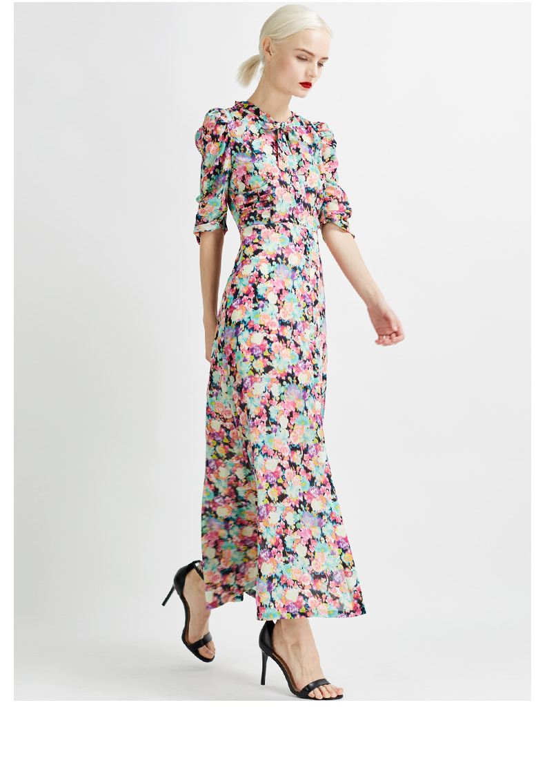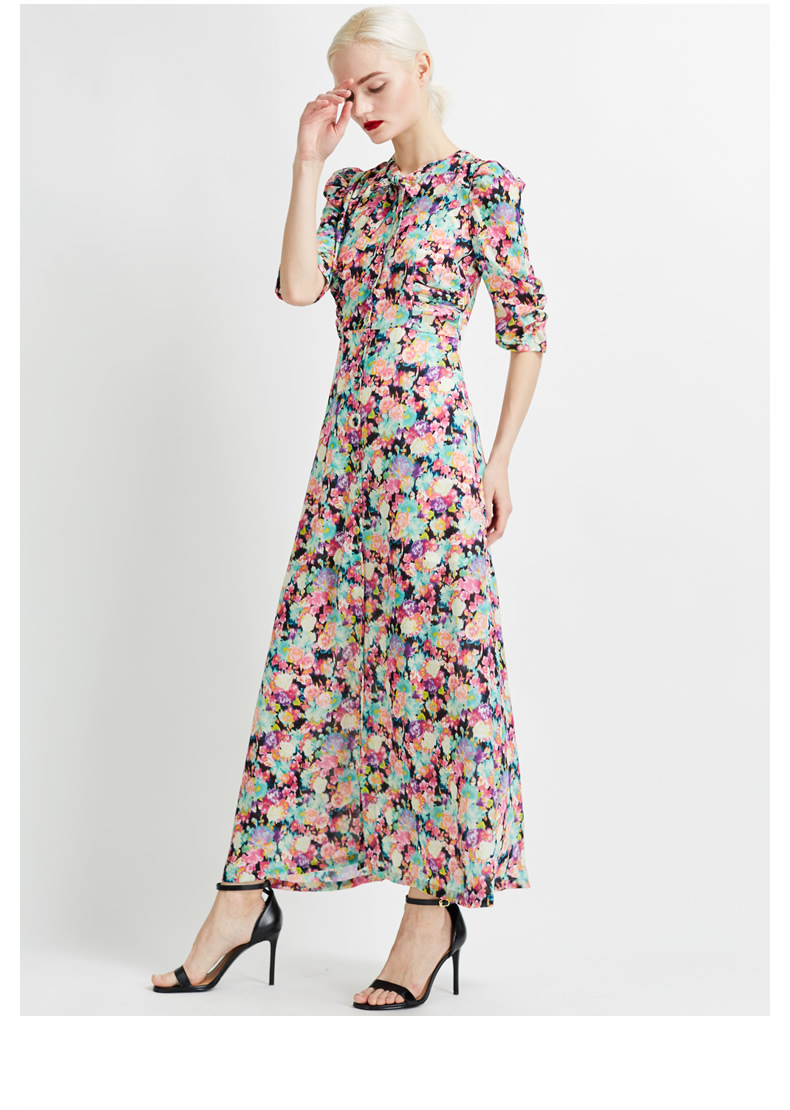 悅空間超長款修身印花連衣裙短袖碎花飄帶女春夏過膝長裙時尚淑女