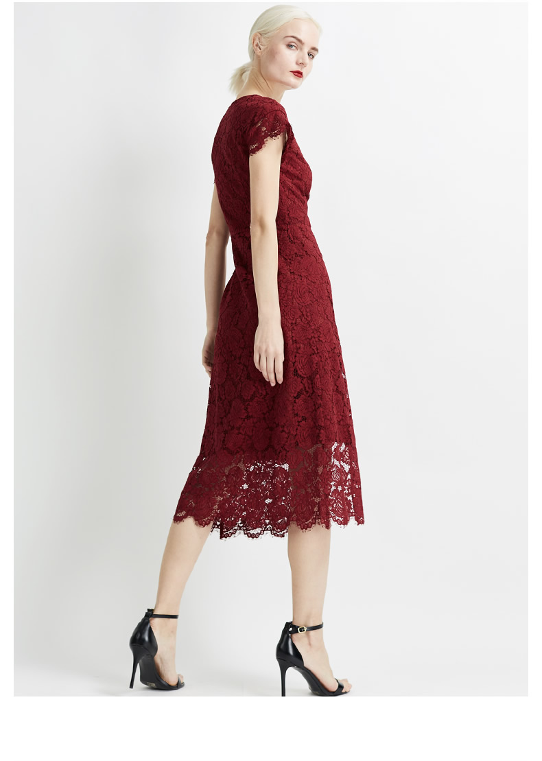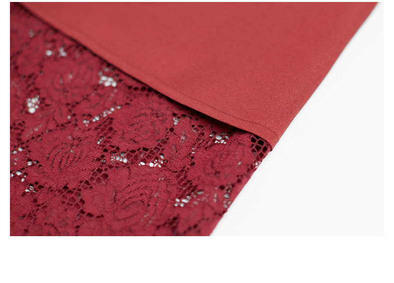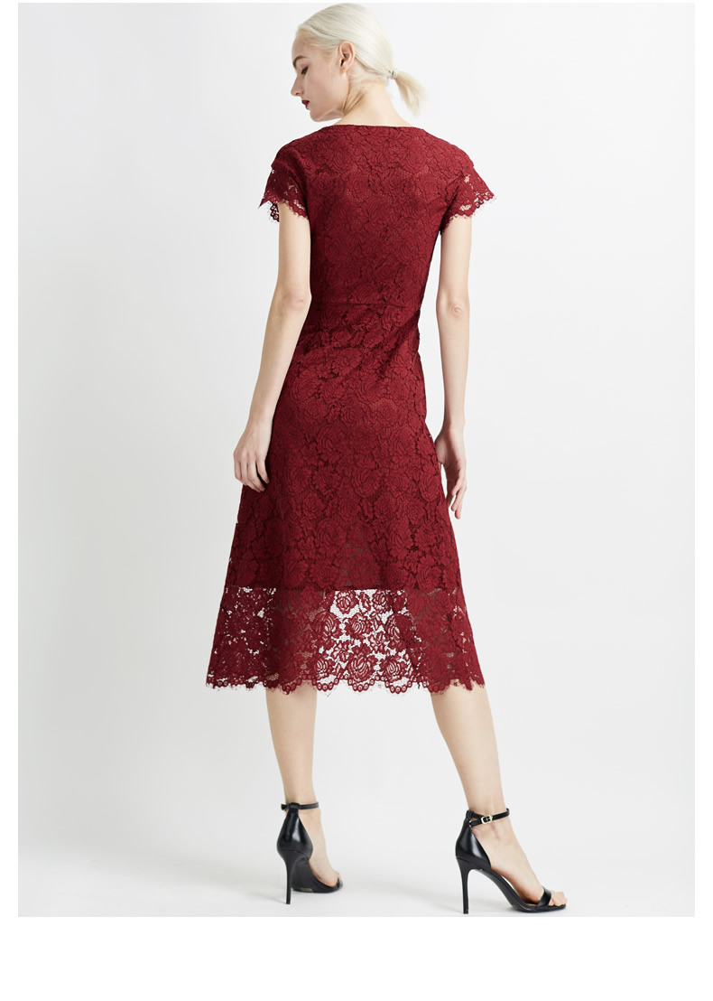 悅空間長款連衣裙內搭蕾絲鏤空修身V領系帶短袖淑女時尚酒紅色夏A