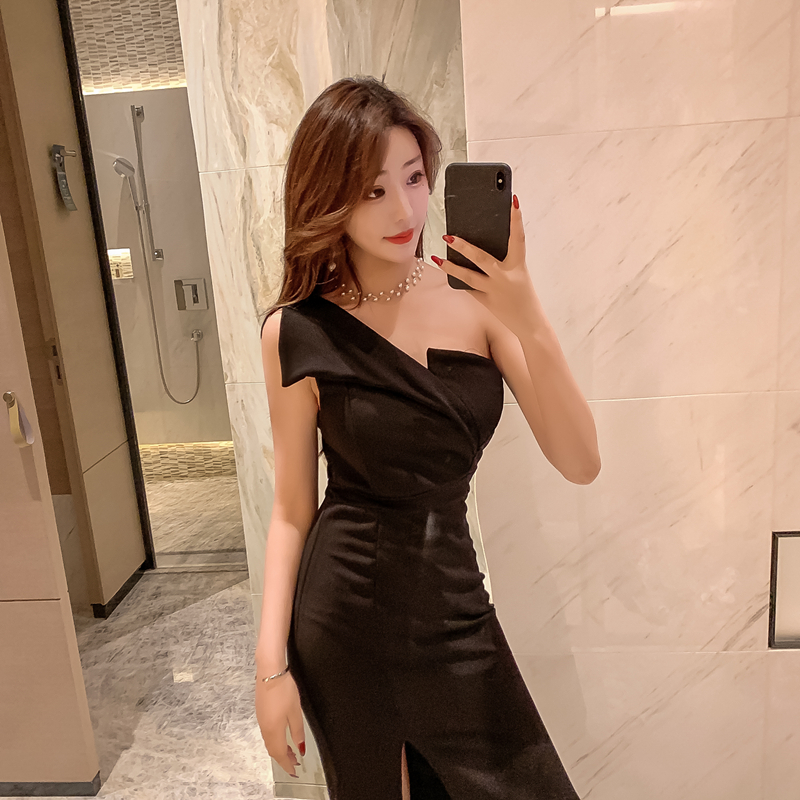 性感晚禮服修身顯瘦魚尾長裙蝴蝶單肩一字領開叉露背氣質連衣裙女