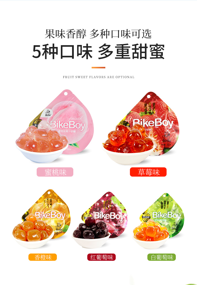 bikeboy果汁軟糖52g*5袋Q彈網紅味糖零食爆漿糖果葡萄藍莓味