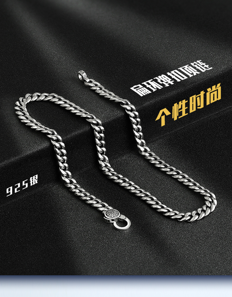 男士簡約大方純銀扁馬鞭鏈潮人項鏈