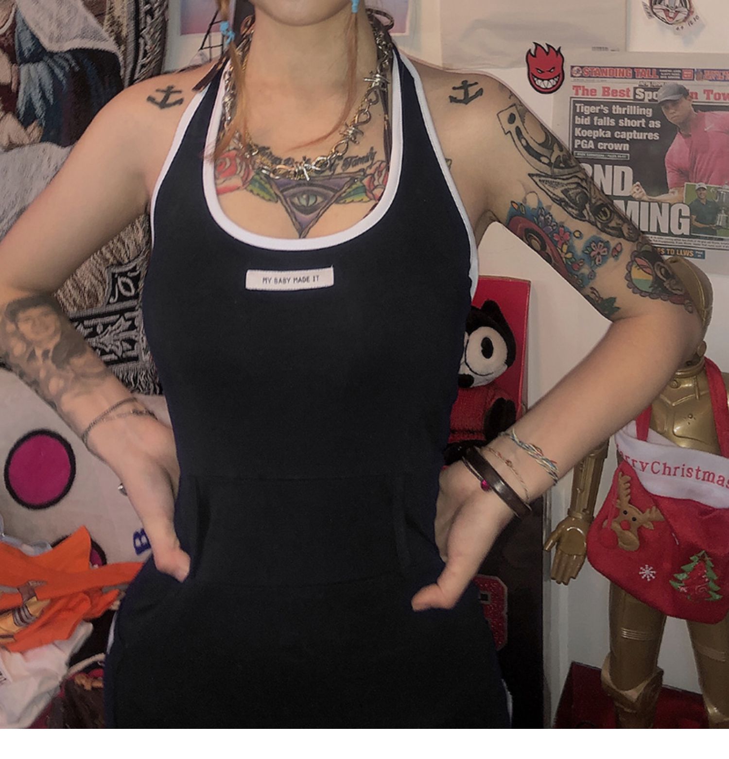 KLIOU 歐美字母貼片掛脖式拼色吊帶連衣裙收腰顯瘦百搭chic短裙女