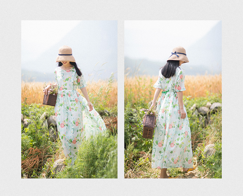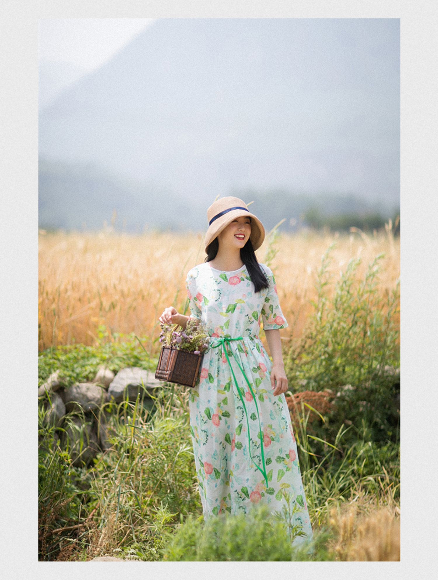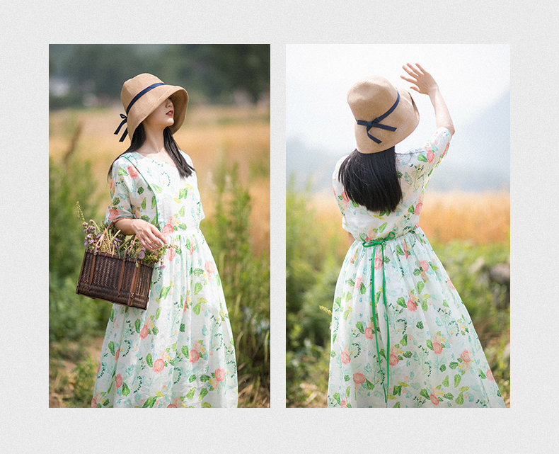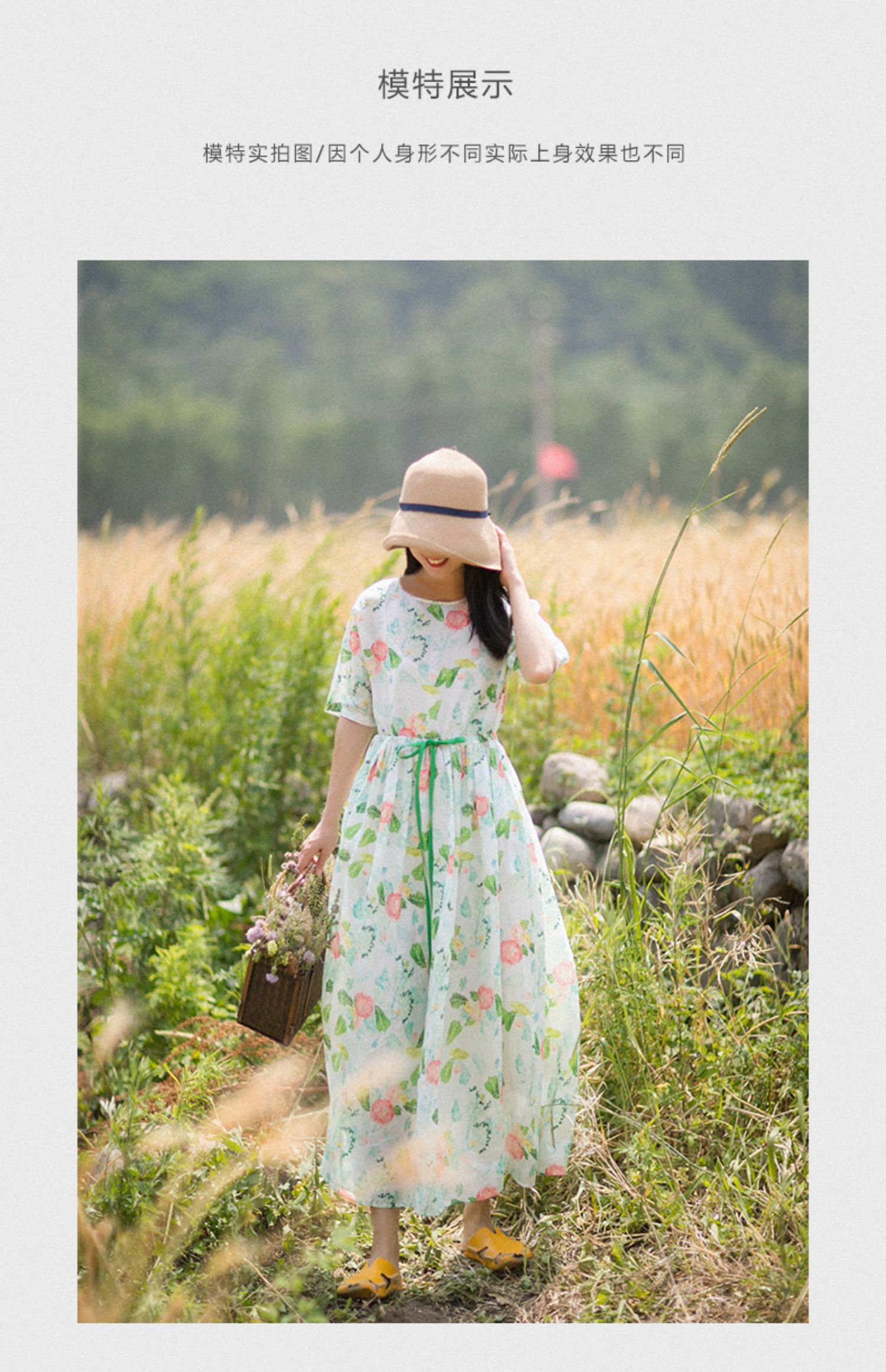 憶舊連衣裙女夏2021新款文藝復古休閑苧麻圓領長裙顯瘦氣質印花裙