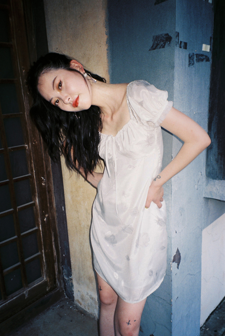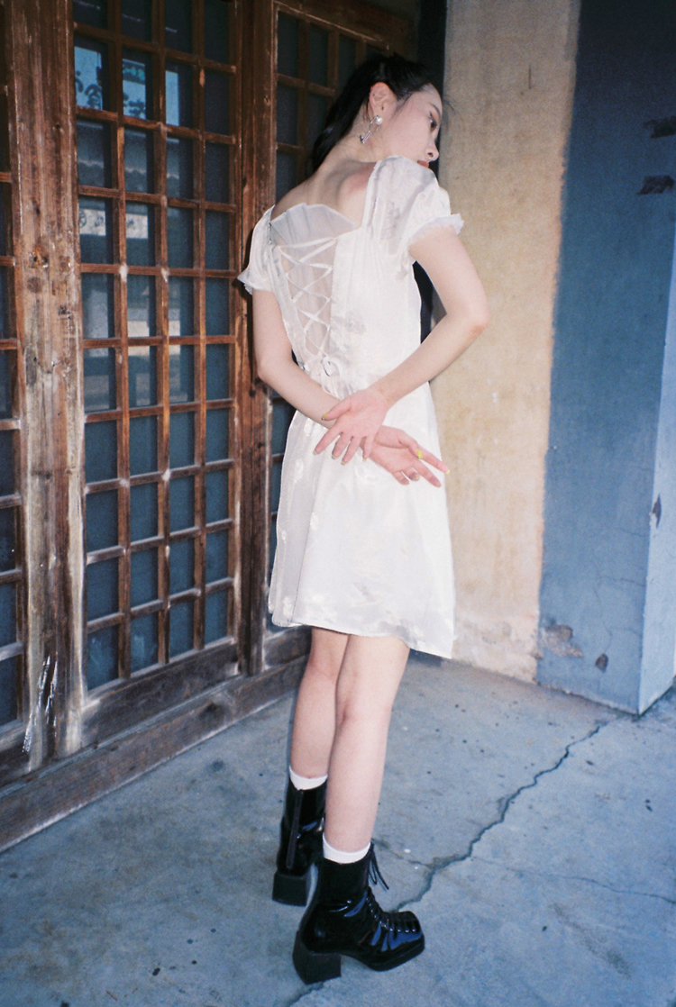 EhK原創設計 復古白色玫瑰繡花緞面光澤泡泡袖連衣裙女夏2023新款