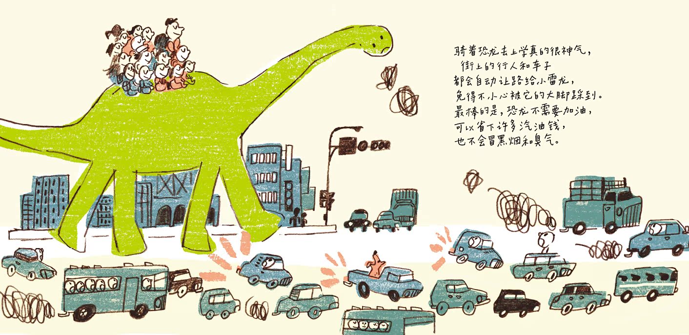 是真的哦,在史派修學校上學的小朋友從來不會賴床,也不會裝病不去上學,因為每天來接送他們的校車是一只小雷龍。騎著恐龍去上學真的很神氣!小雷龍不需要加油,也不會排放黑煙和臭氣,還是大家的好幫手。不過,小雷龍太巨大了,因此惹了不少麻煩