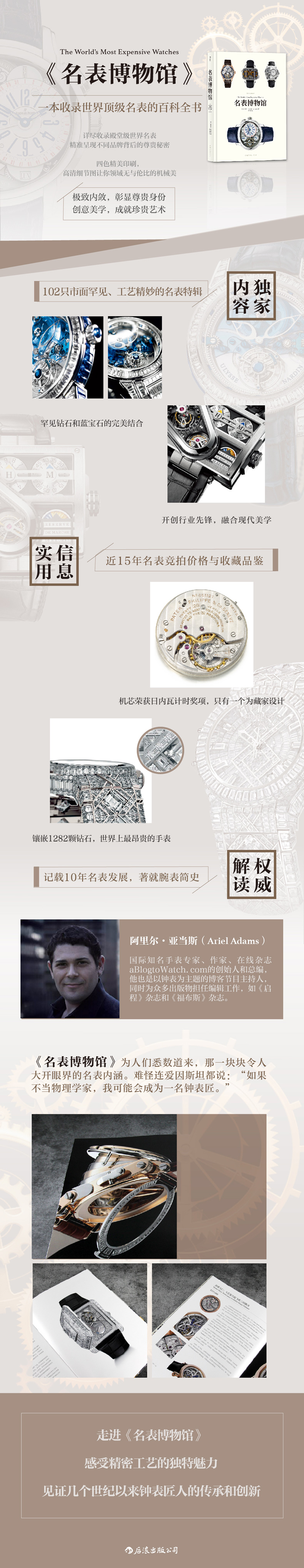 這本阿里爾·亞當斯著的《名表博物館(精)》中展示了一些全世界最奢華、最復雜、**收藏價值,亦或最有趣的當代腕表。它們價格不菲,起價約20萬美元,有些甚至高達500萬美元。跟隨作者,我們仿佛經歷了一場過去10年的腕表之旅。由于歷史原因,這些腕表在拍賣會上都拍出了極高的價格。