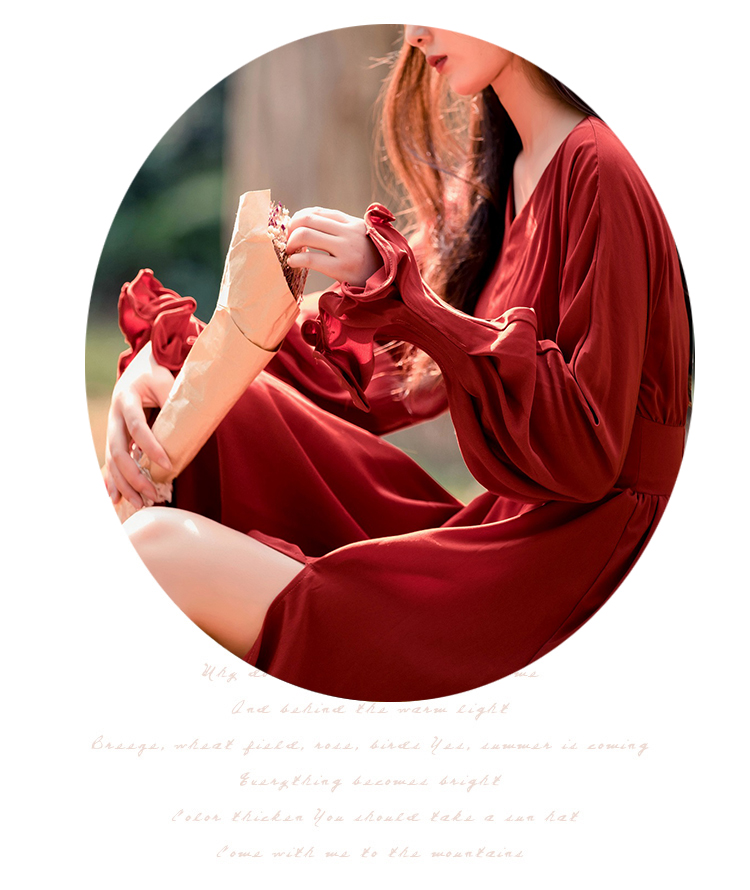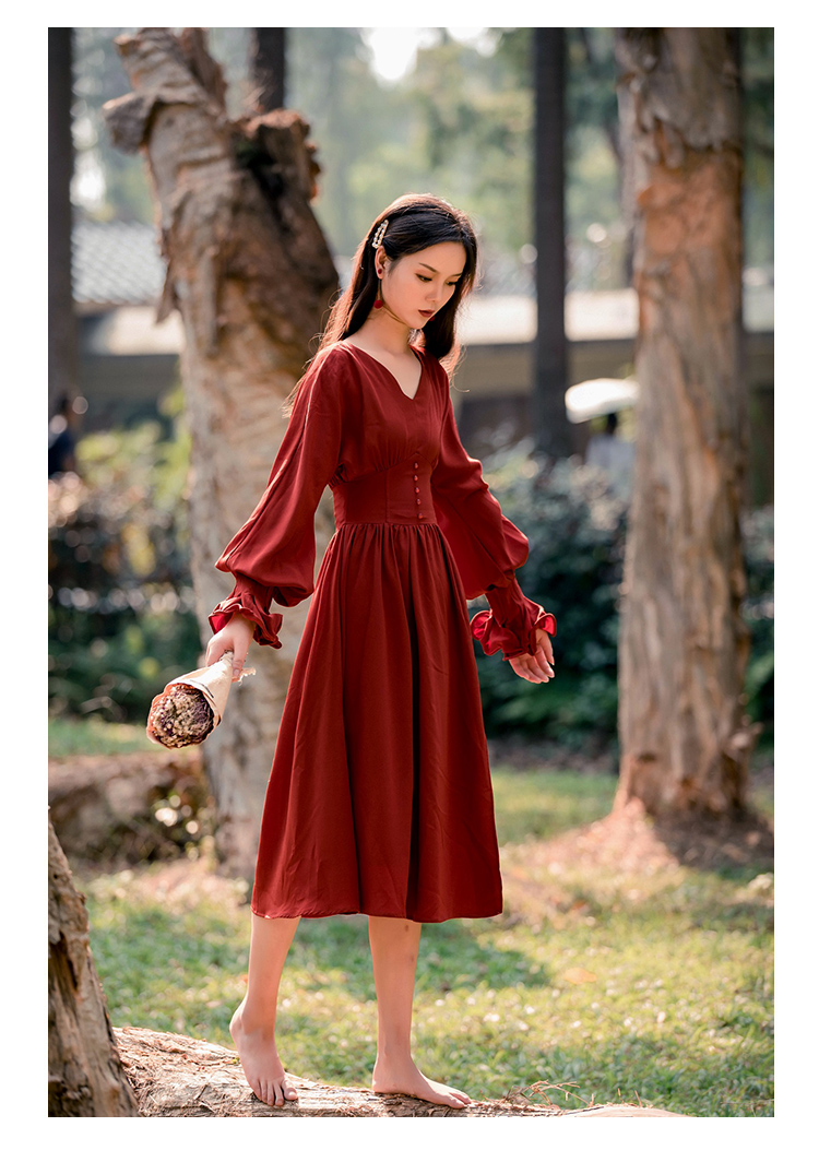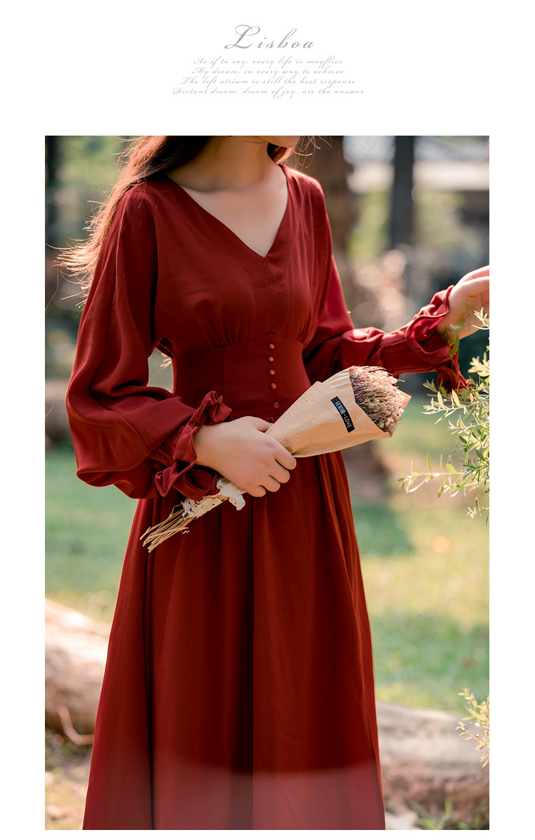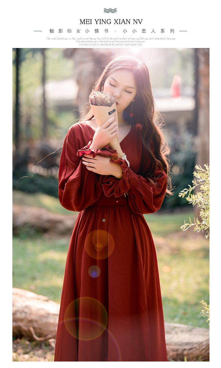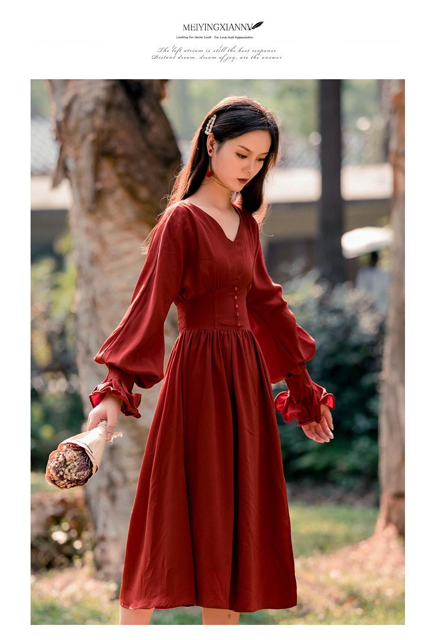 魅影仙女 法式中長款連衣裙收腰顯瘦桔梗裙長袖v領超仙紅色裙子秋