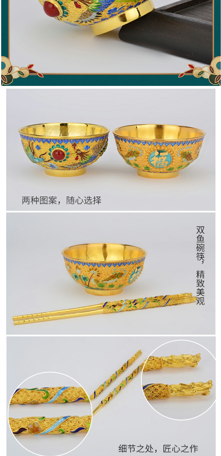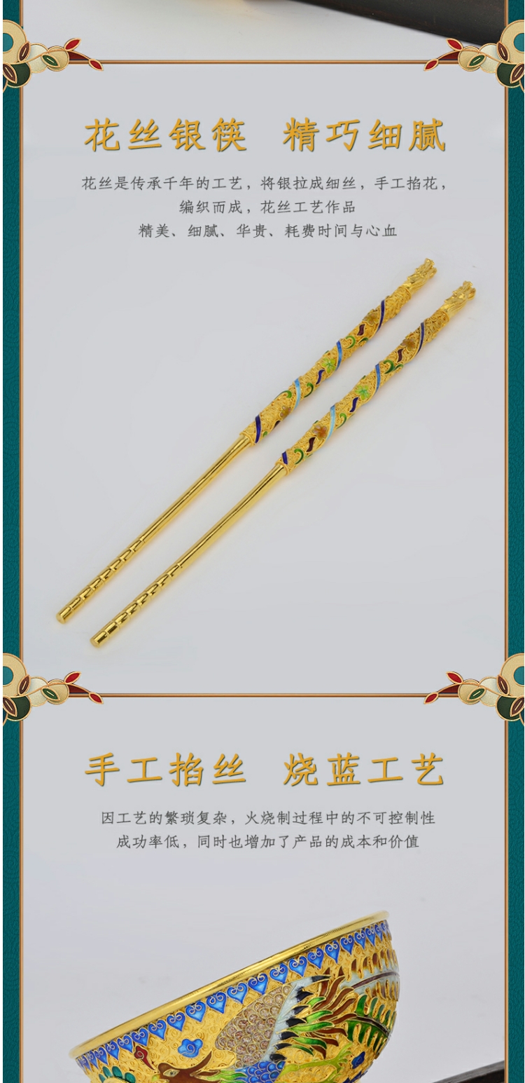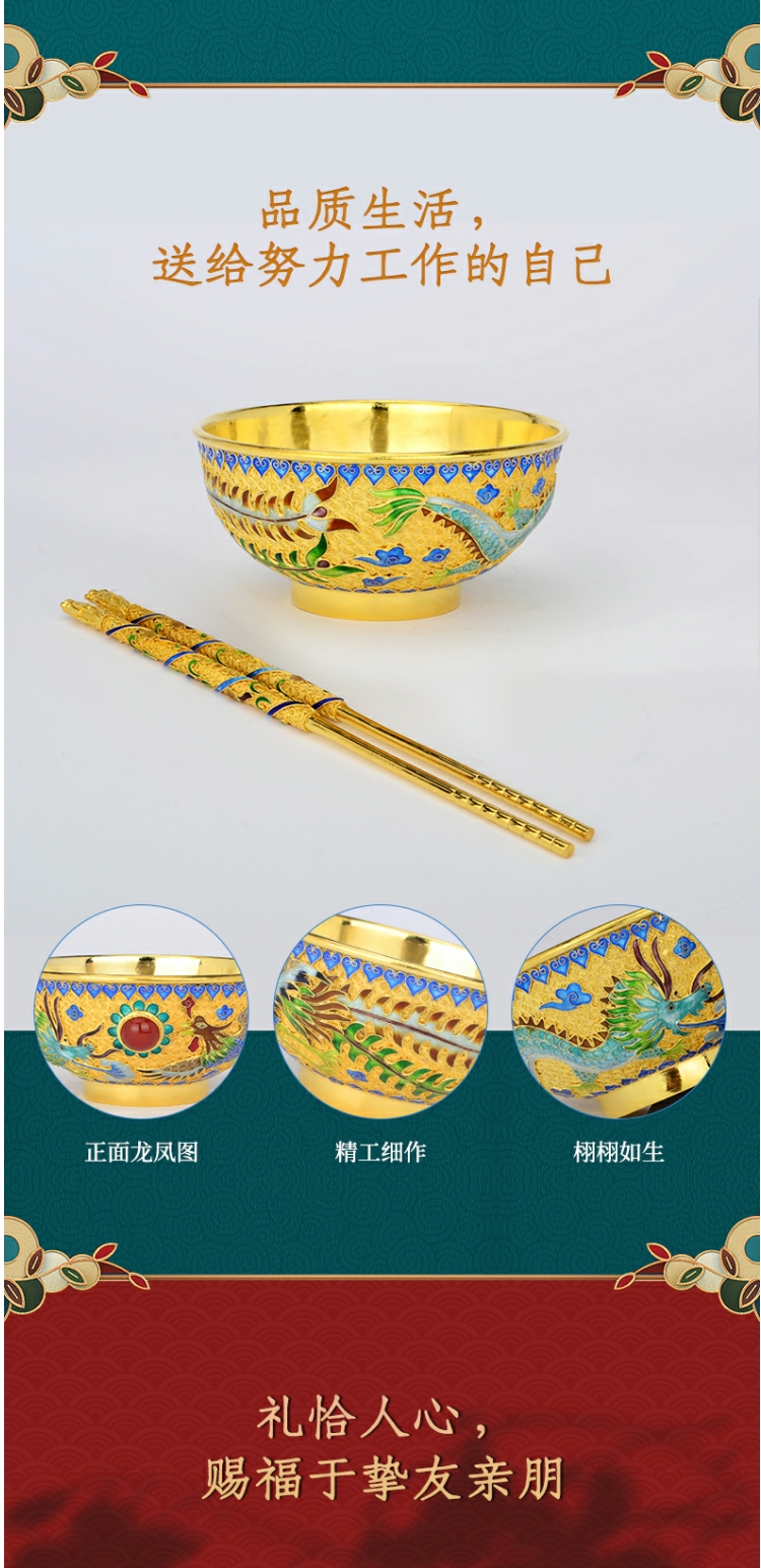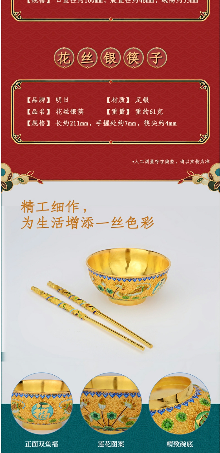 明日銀碗純銀餐具套裝家用銀碗筷鍍金手工花絲銀結婚送禮