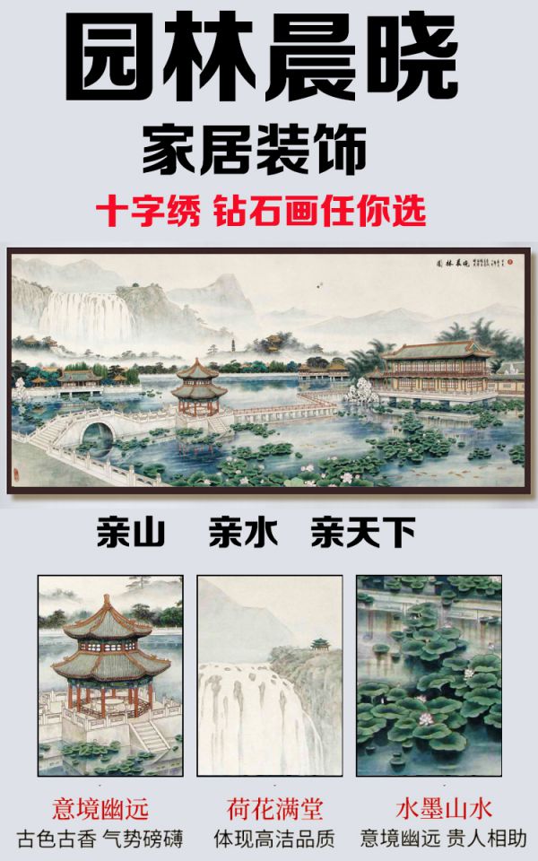 園林晨曉十字繡2023新款鉆石畫古風客廳掛畫新中式荷花荷塘點鉆繡