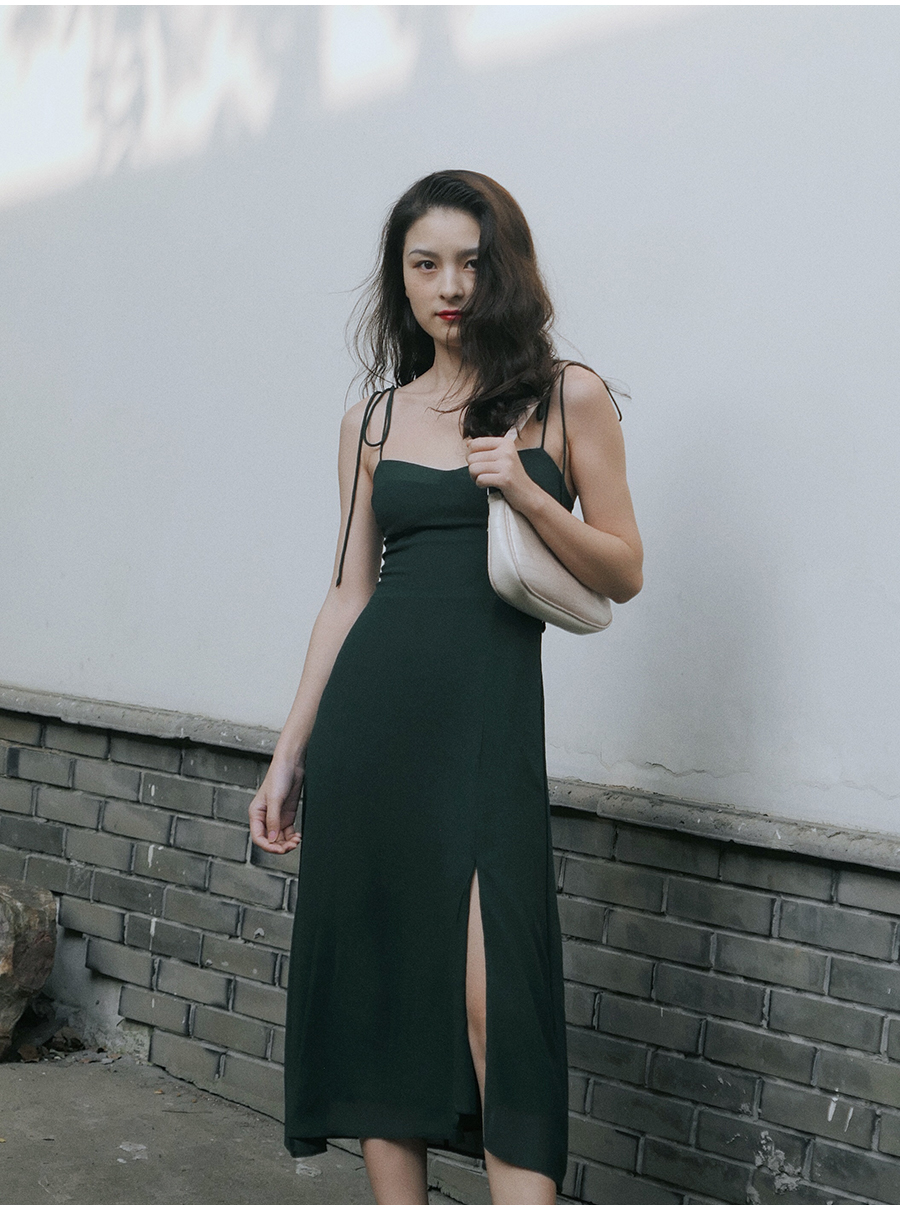 早春新款法式復古黑色緞面側褶皺開叉顯瘦吊帶裙茶歇裙連衣裙女