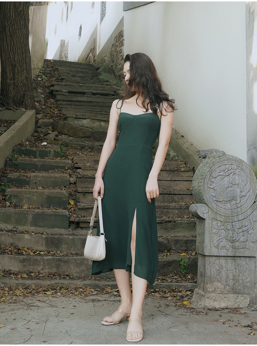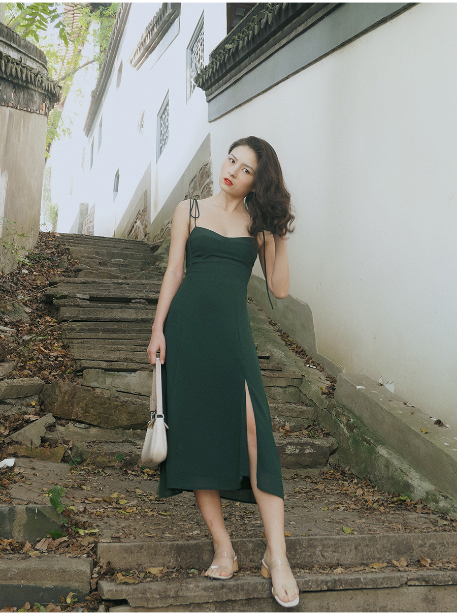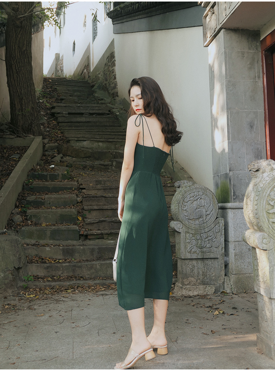 DT 法式復古小眾墨綠顯白人魚修身度假風吊帶裙魚尾桔梗連衣裙女