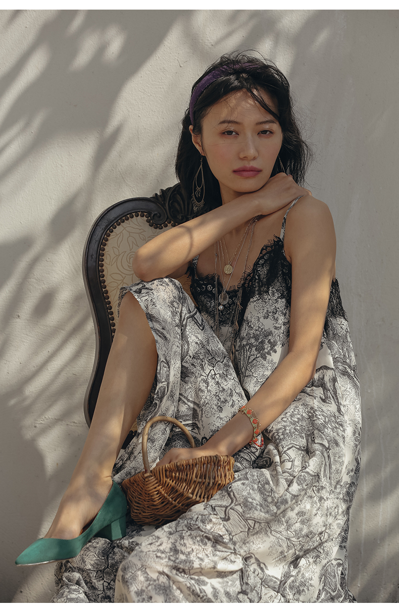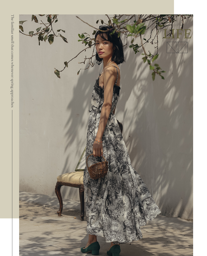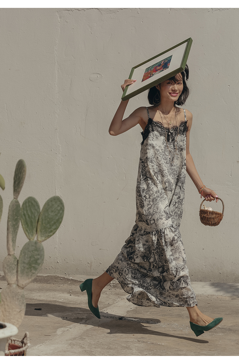度假女王復古海邊印花吊帶連衣裙
