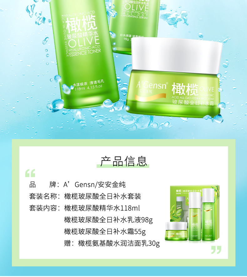 安安金純護膚品官網橄欖油玻尿酸全日護膚套裝乳液安安補水霜正品
