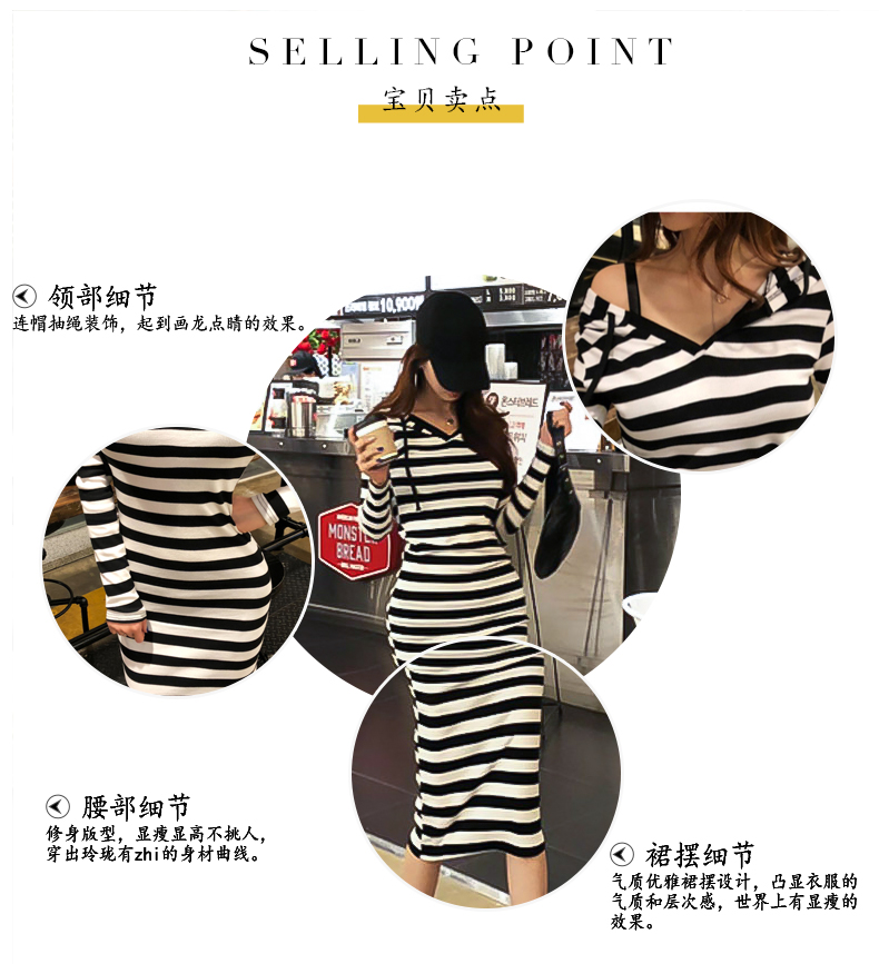 條紋連帽女中長款氣質收腰衛衣裙