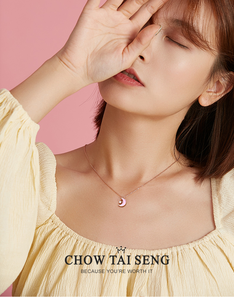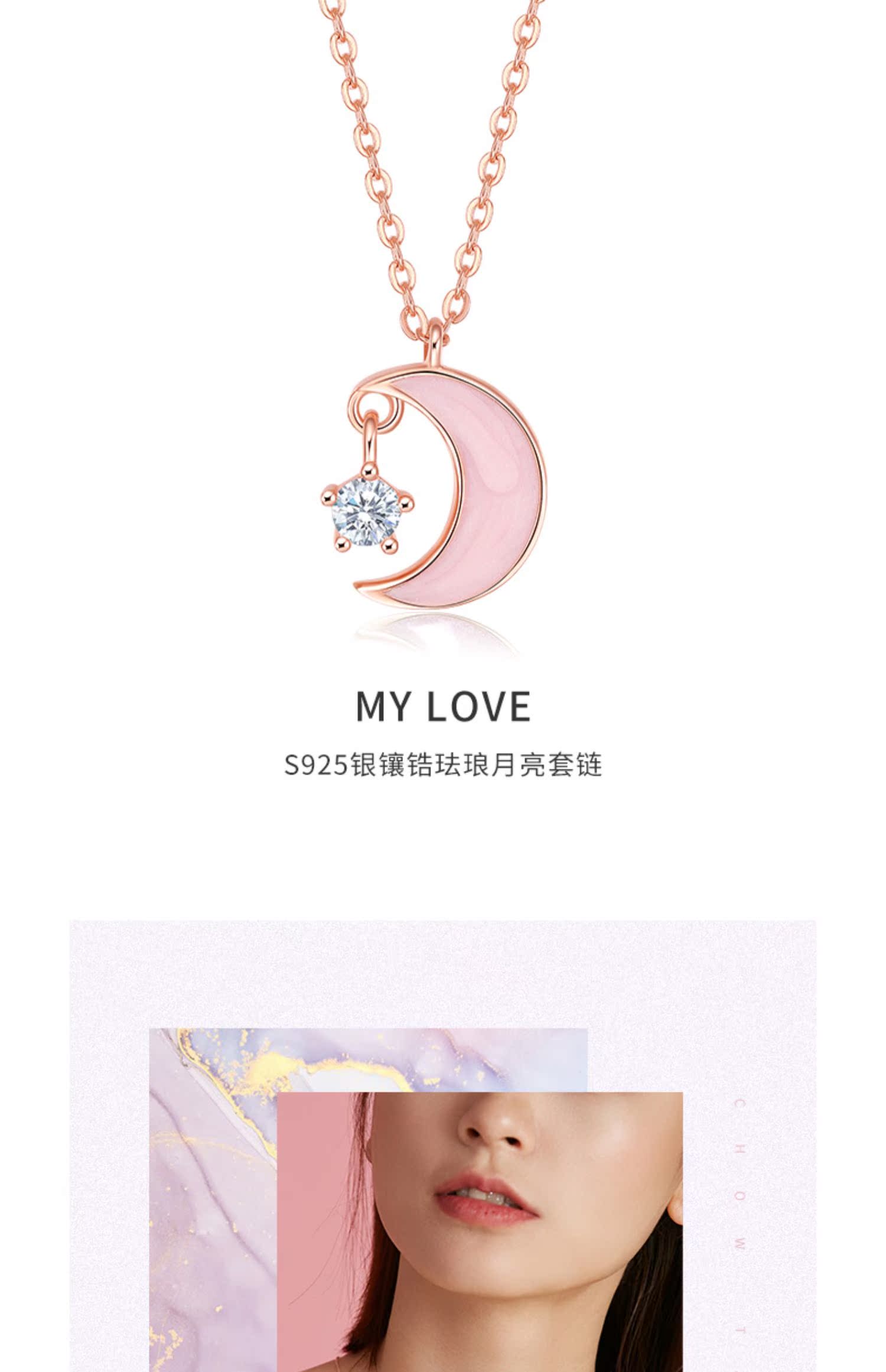 周大生粉色星月項鏈女生輕奢小眾純銀鎖骨鏈月亮吊墜生日禮物