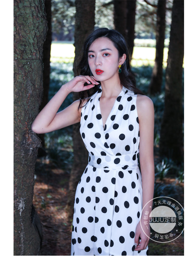 JUJU氣質掛脖連衣裙法式復古無袖V領波點傘裙收腰新款裙子女夏季