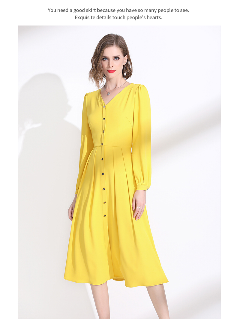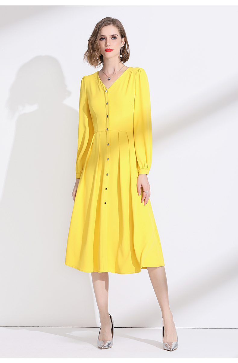 黃色裙子春秋連衣裙女長袖2023年新款v領簡約氣質長裙腳踝森系