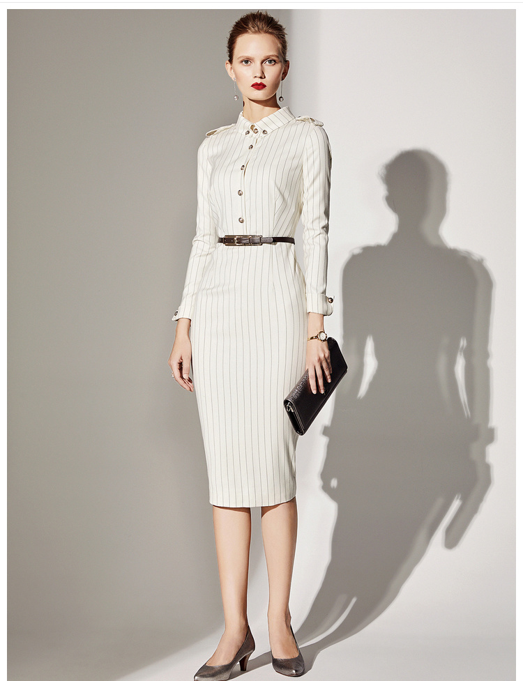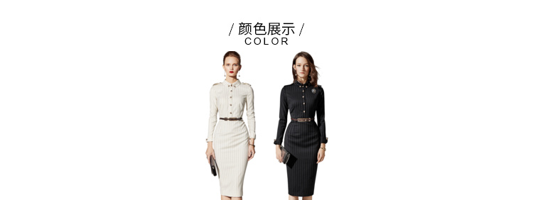 頸袖添香連衣裙女修身收腰包臀正裝職業OL通勤中長款羊毛條紋時尚