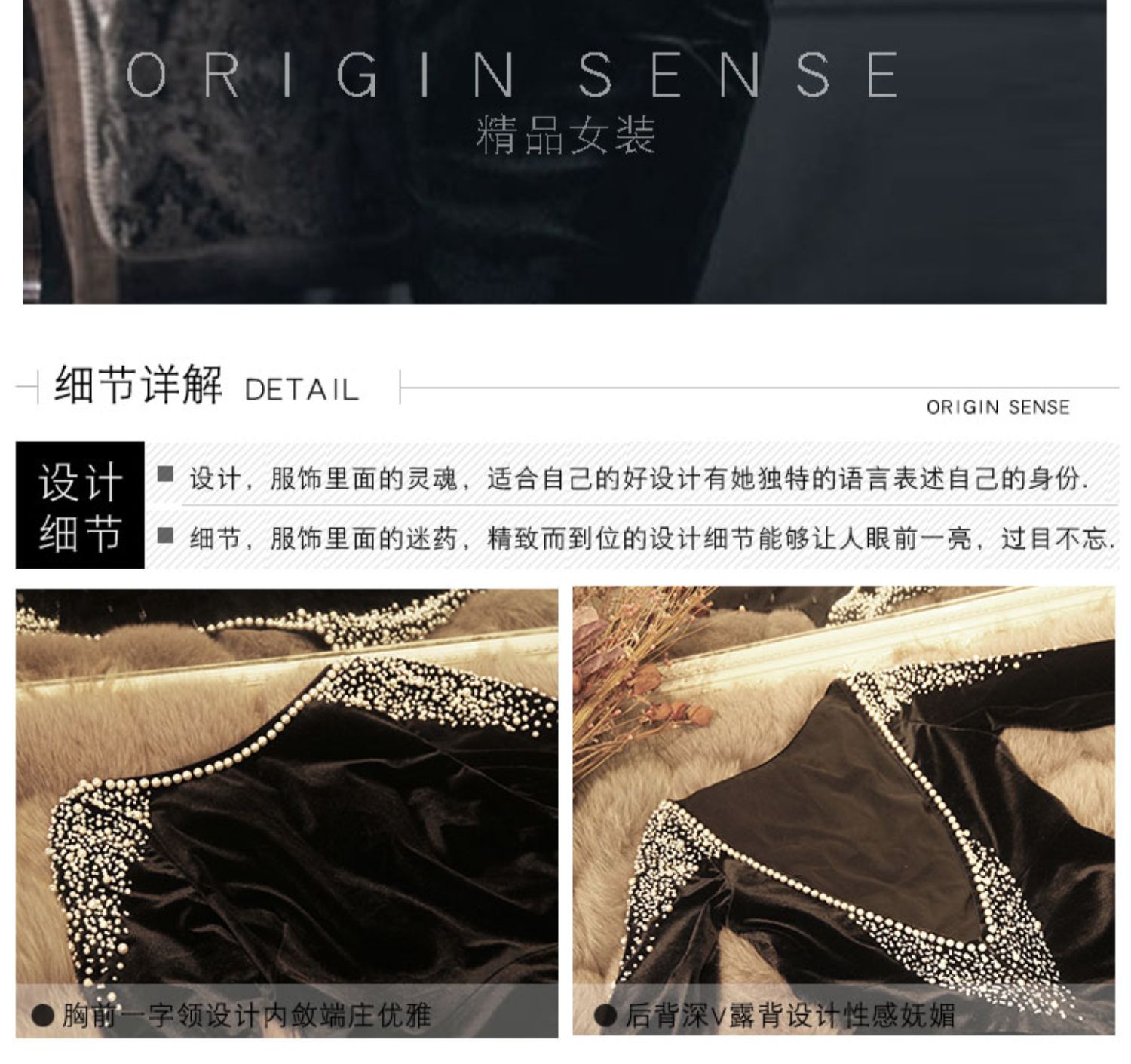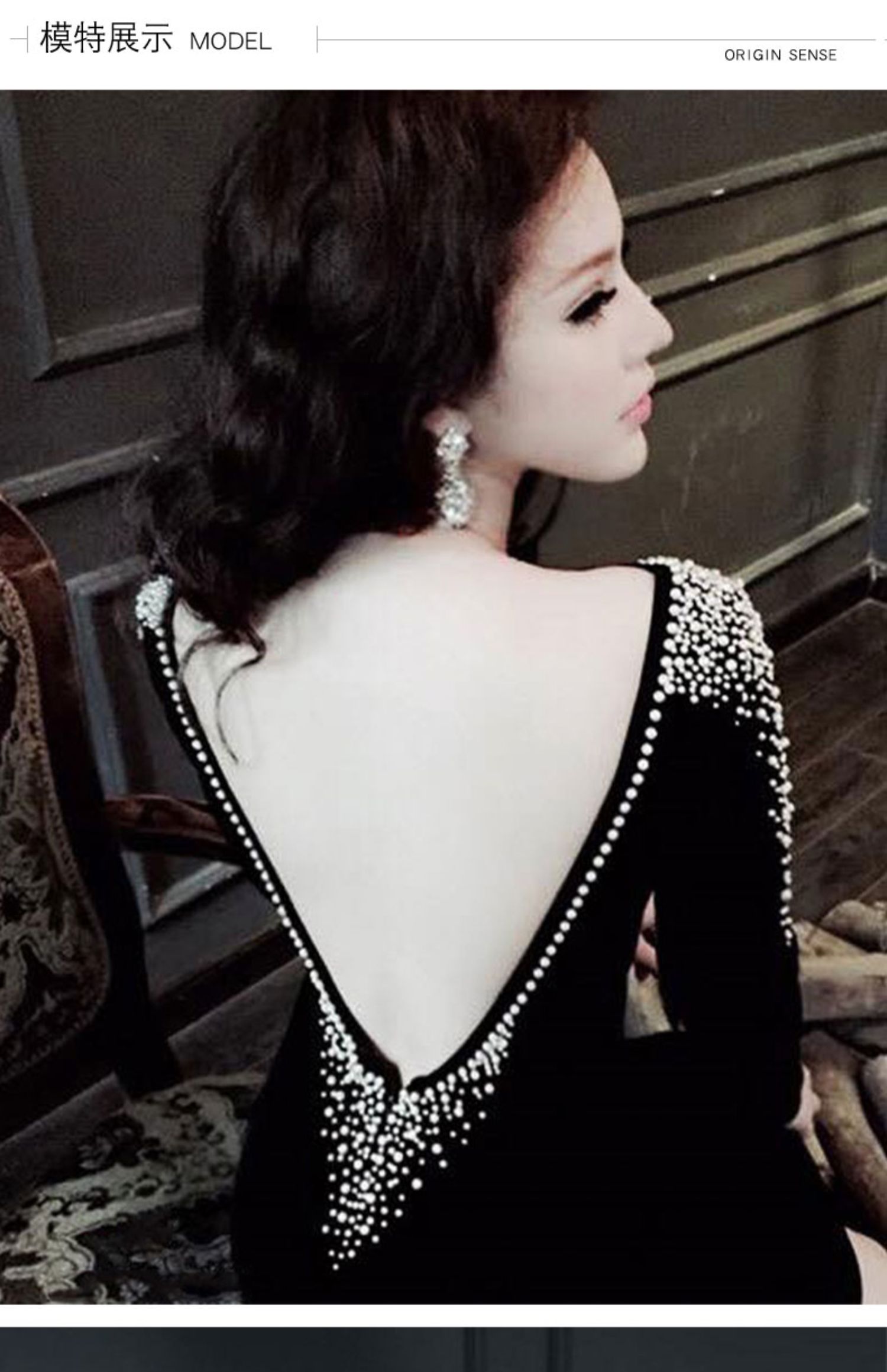 長袖絲絨連衣裙新款高端黑色露背珍珠重工性感深V金絲絨小禮服女