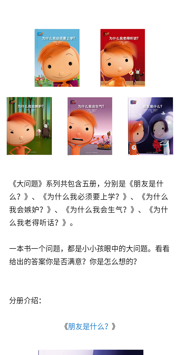 大問題 5冊培養孩子情商的兒童情緒管理心理成長故事書 朋友是什么?,為什么我必須要上學,我會嫉妒,我會生氣,我老得聽話 讀庫